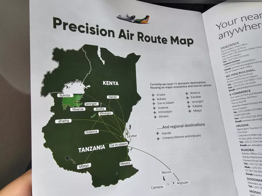 Precision Air е мрежова авиокомпания, която предлага свързващи полети през летища Dar es Salaam DAR или, Килиманджаро JRO или Занзибар ZNZ.