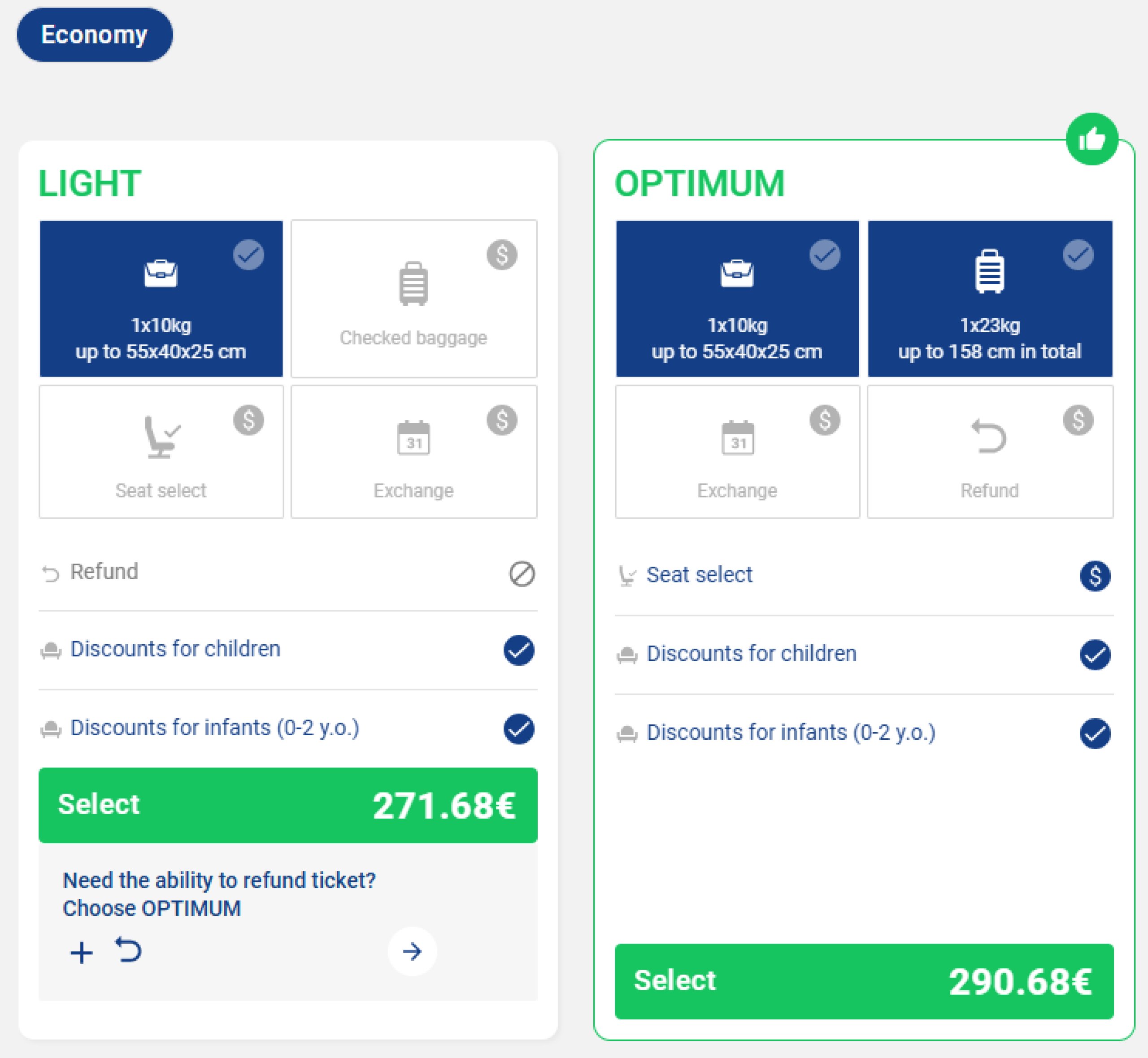 - Optimum - ръчен багаж и регистриран багаж до 23 кг, избор на място срещу заплащане, промени и анулиране са разрешени срещу заплащане.