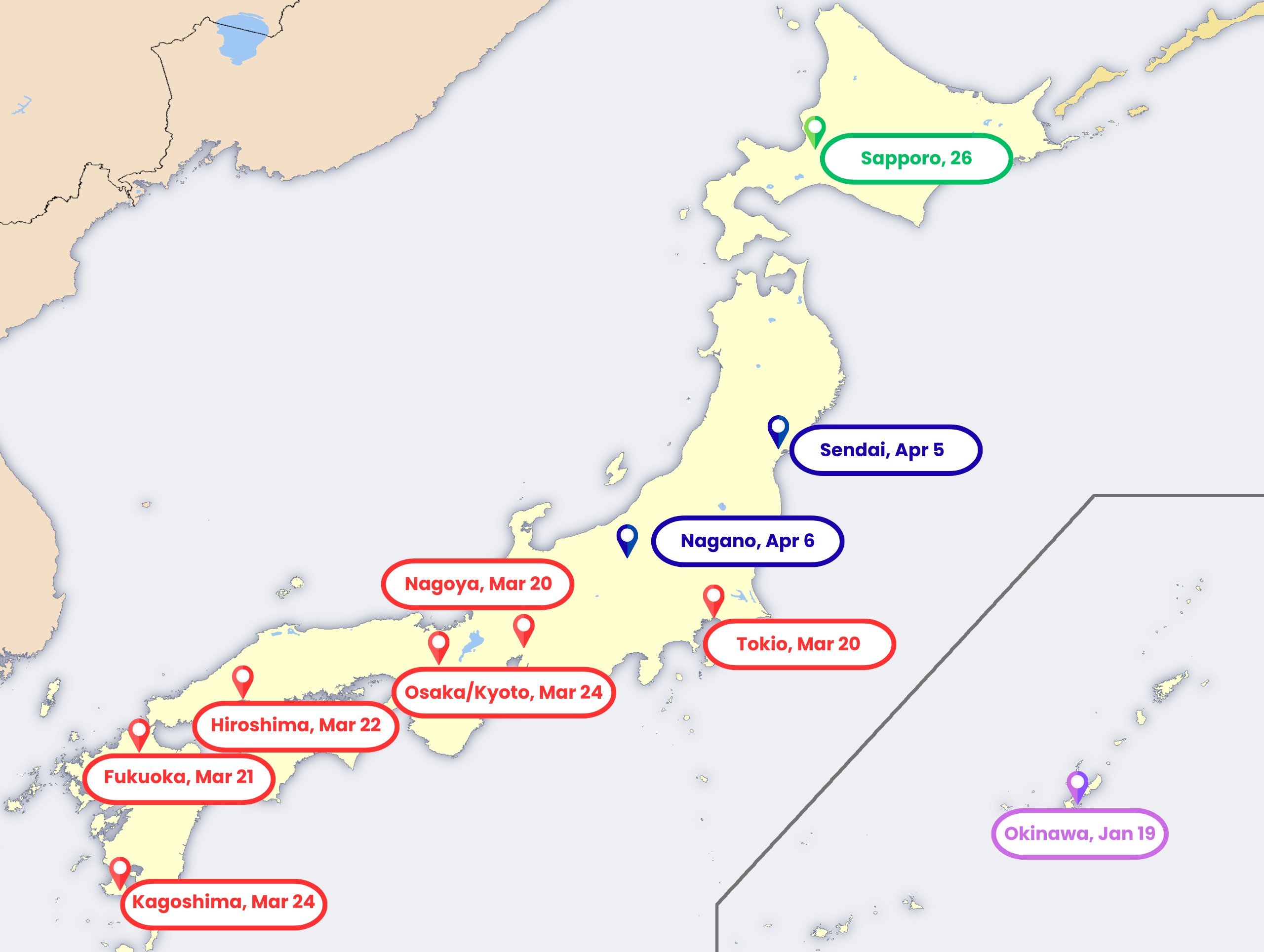 Цъфтежът на сакурата напредва от юг на север, така че разликите между отделните региони могат да бъдат няколко седмици. Картата по-долу показва типичния ход на сезона.