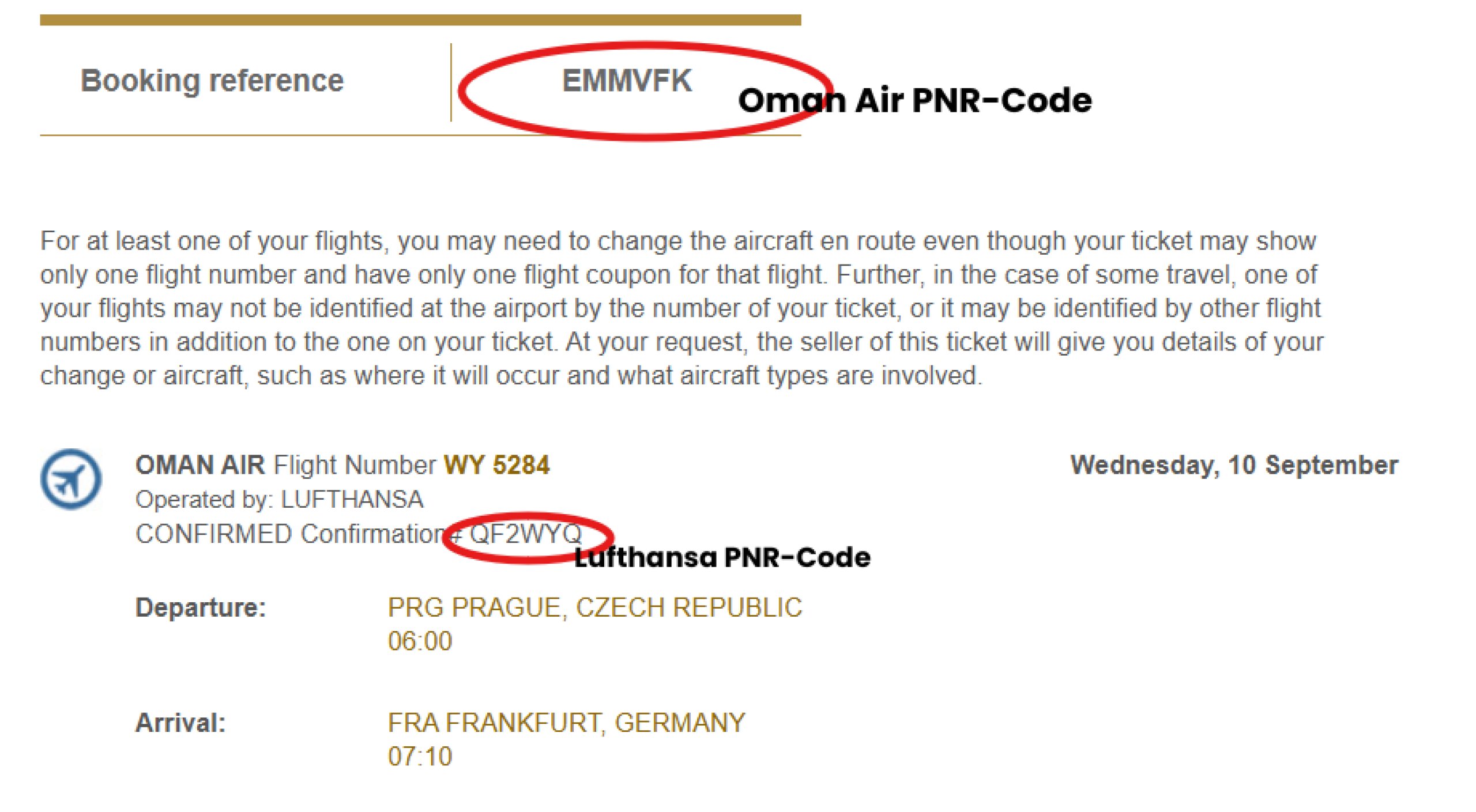 Всички полети бяха закупени като една резервация, но полетът на Lufthansa от Прага до Франкфурт имаше различен PNR код от полета на Oman Air от Франкфурт FRA през Маскат MCT до Занзибар ZNZ.