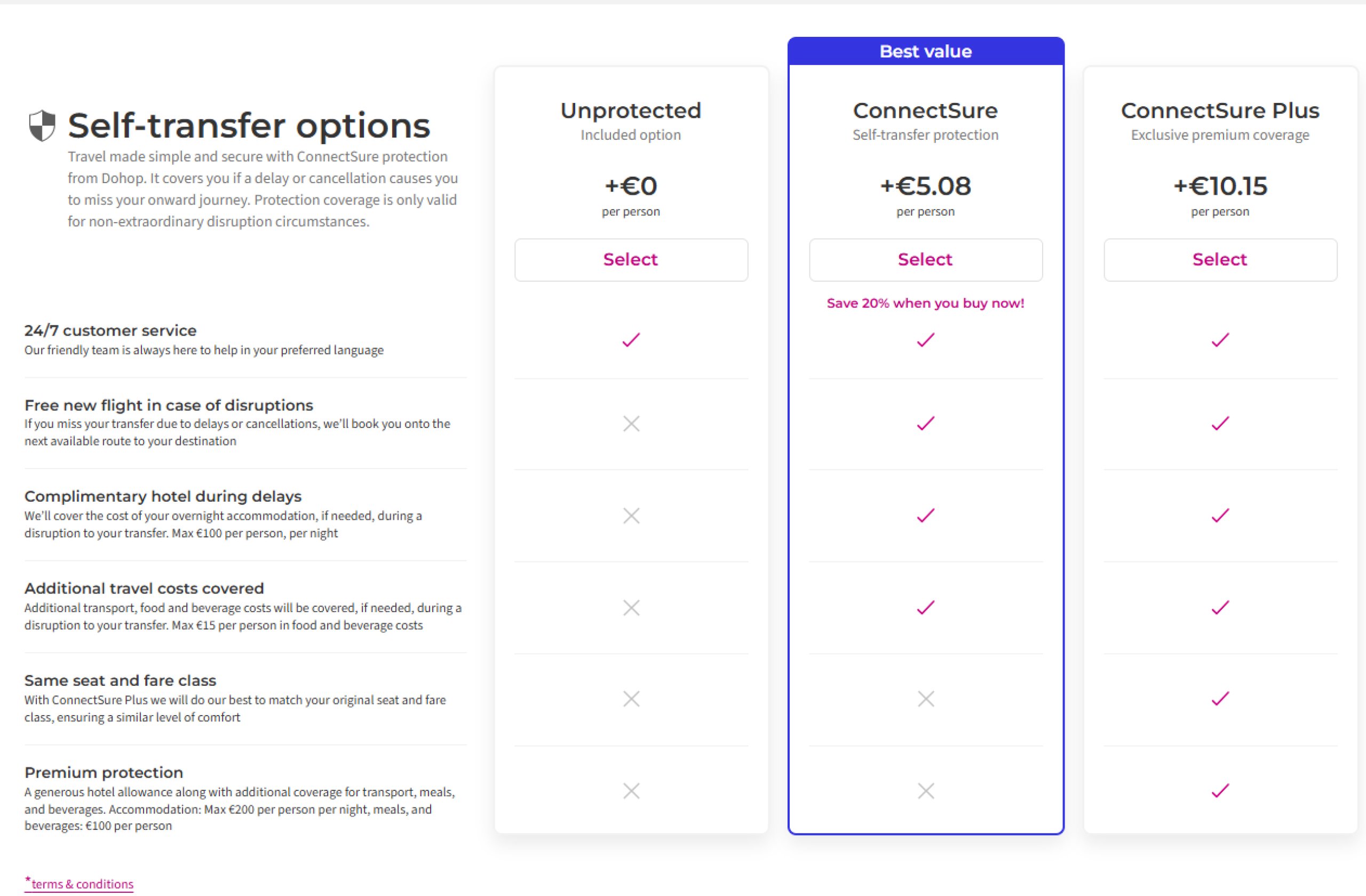 Ако искате да имате гарантиран свързващ полет, трябва да закупите заедно с билетите си и ConnectSure, което се избира по време на процеса на резервиране на полета.