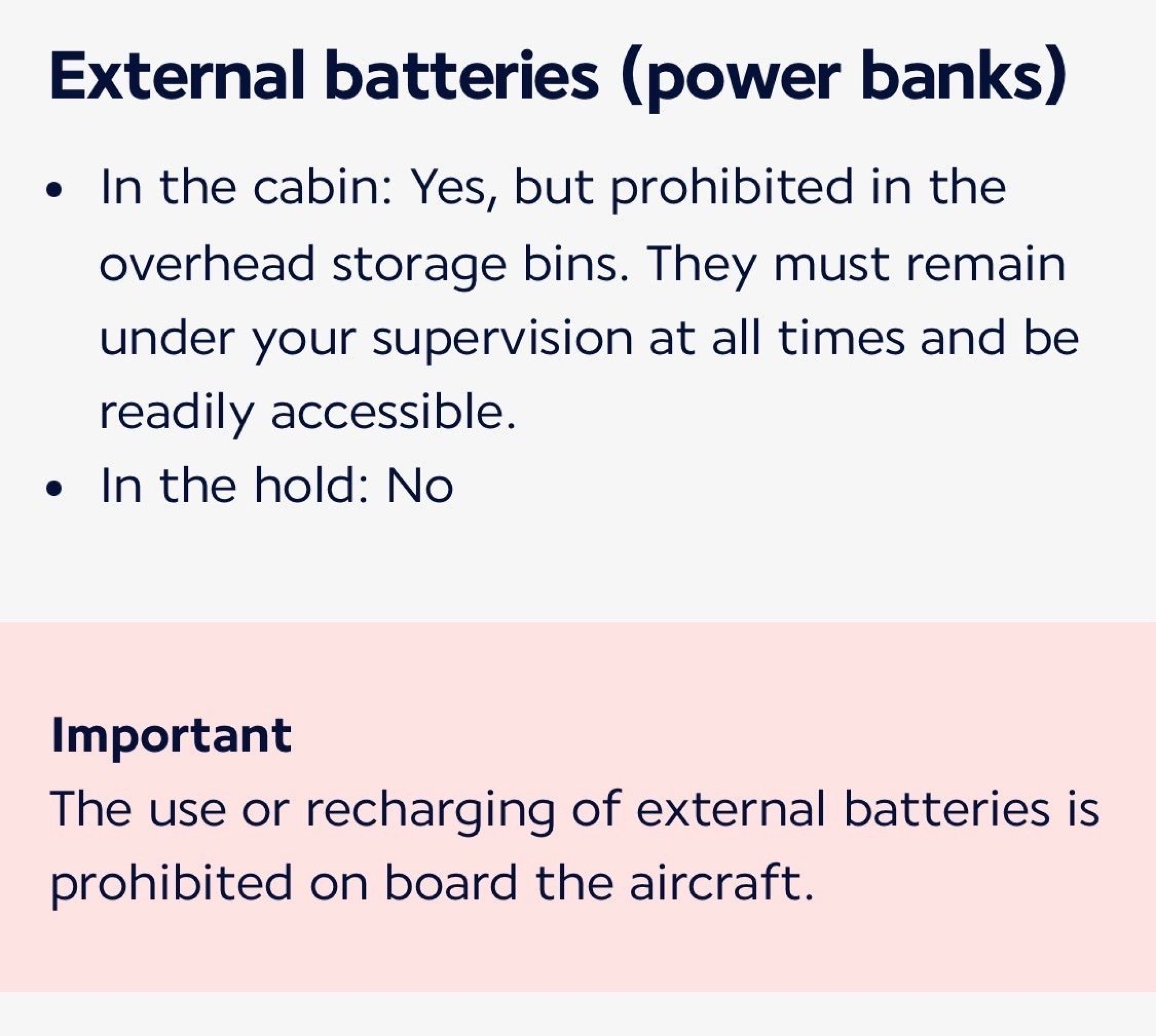 При някои авиокомпании (вж. списъка в края на тази статия) трябва да държите захранващата си банка извън ръчния багаж - например в джоба на седалката пред вас, а не в кошчето за храна над главите.