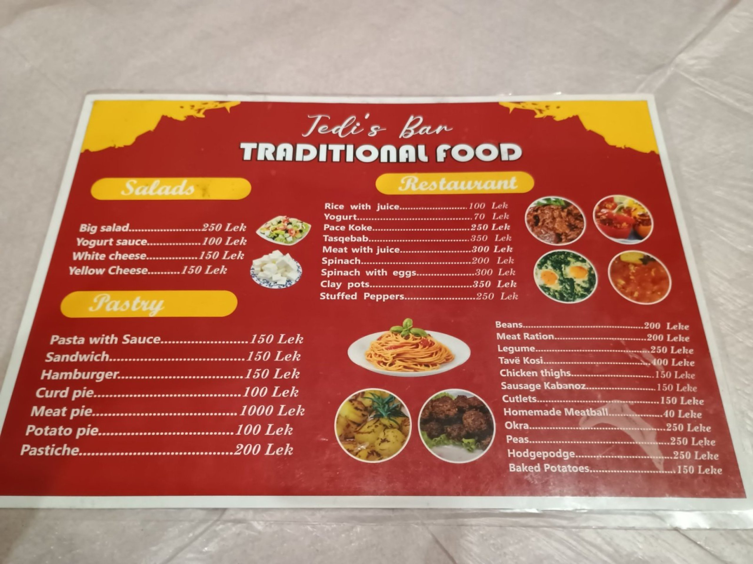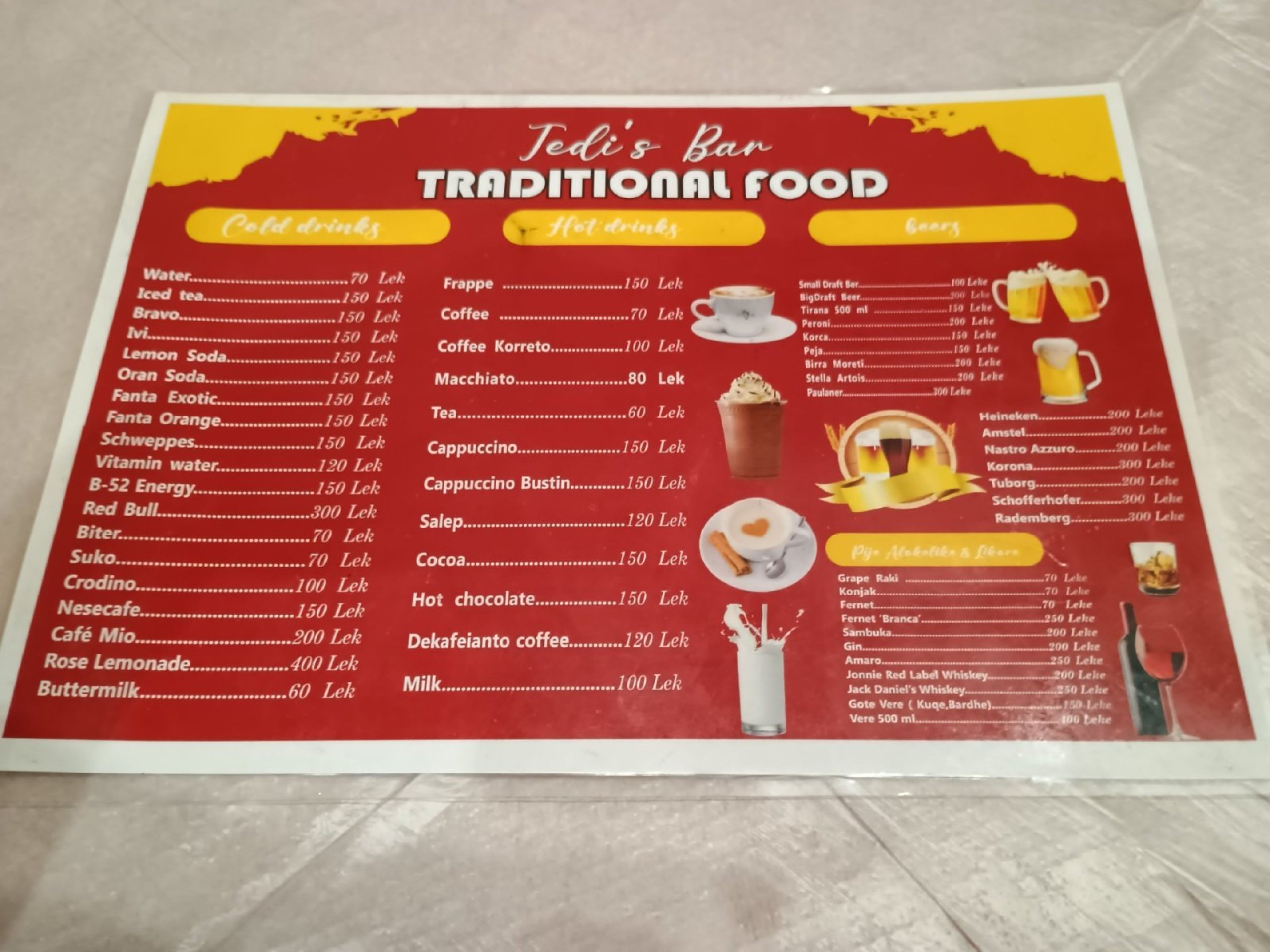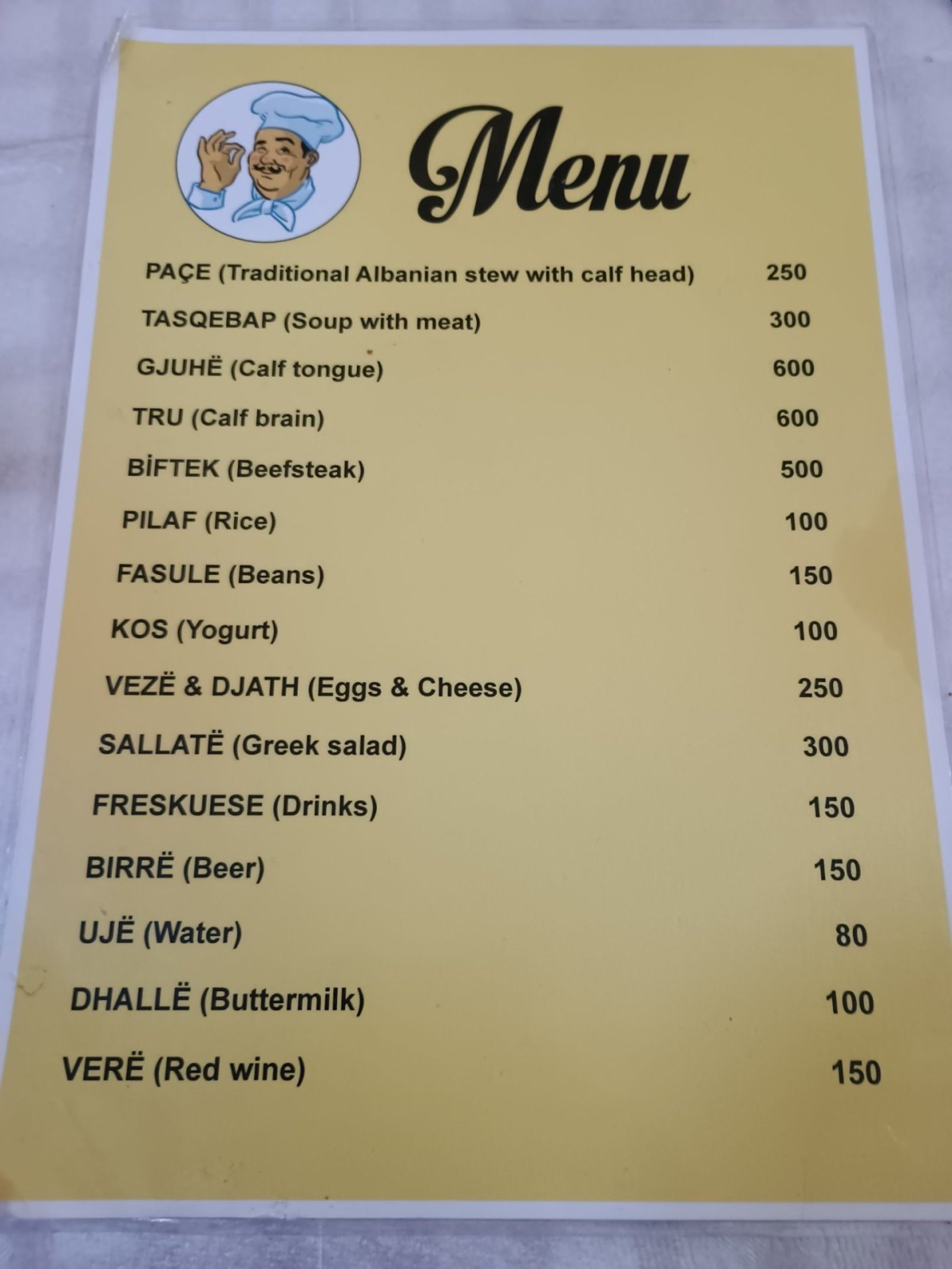 Прилагам менюто от обикновен албански нетуристически ресторант близо до автогарата в Драча и пазара в Тирана - доста голяма разлика в сравнение с цените в ресторантите на туристическите места.