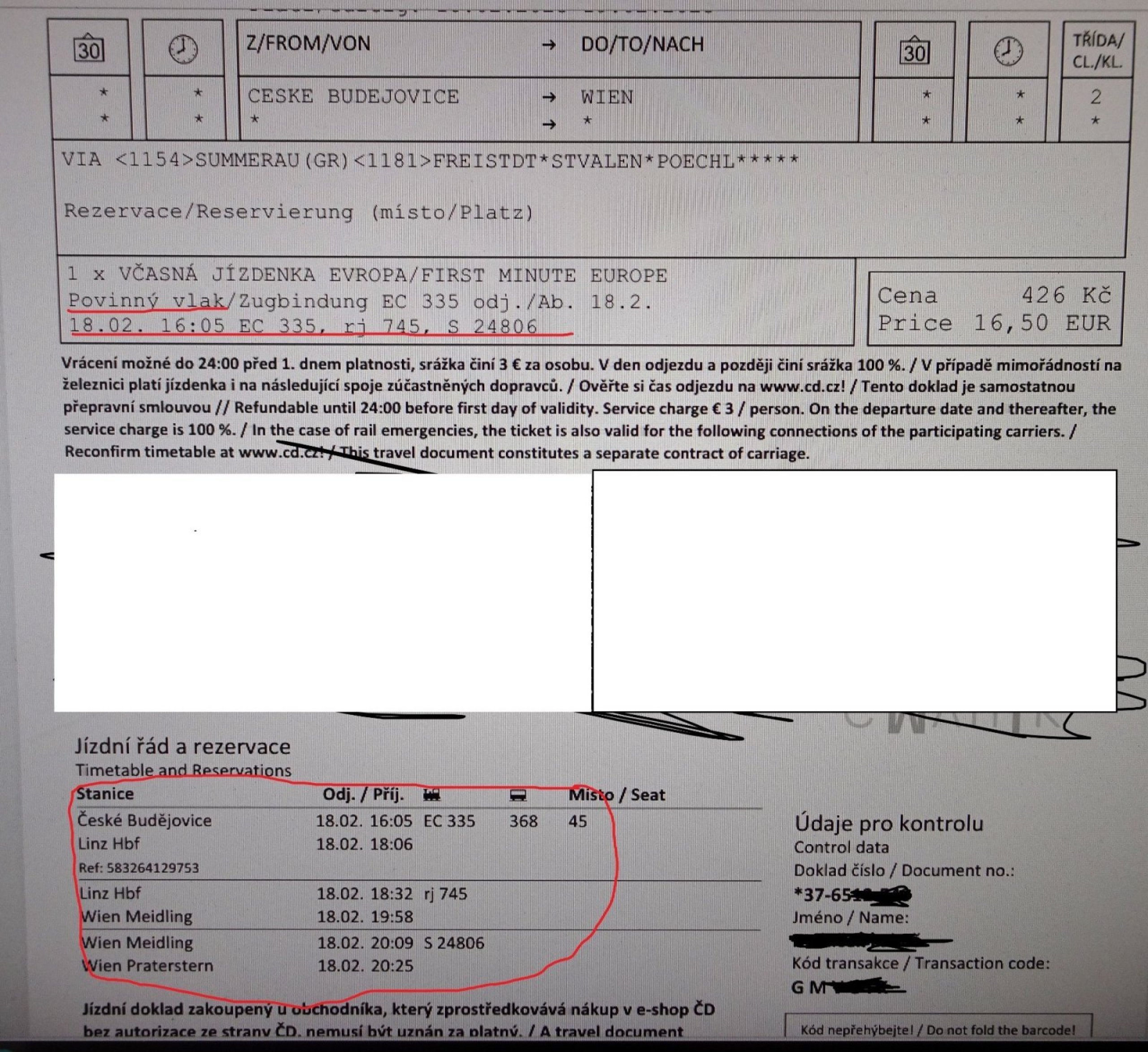 Така че аз просто съобщавам правилното решение - международният билет не е до Hbf, както уверено написа lma тук, а от град до град, т.е. от всяка спирка в Прага до всяка спирка във Виена, независимо дали уебсайтът на ČD или OEBB може да го продаде директно. Там, където може, можете да видите, че ще предложи същата цена като само на Hbf. Тъй като разликата в цената на билета до Виена и до летището обикновено е 10-15 евро, си струва да се купи само до Виена, но дори и тогава не е необходимо да се купува S-bahn и мисля, че 4,60Е, а само от Wien Kaiserebersdorf за 2,20. Предполагам (но не знам), че е необходимо влакът да спира там, така че вероятно няма да работи за Railjet и т.н., и разбира се, че въпросният влак може да се вземе с железопътна карта, т.е. не CAT.