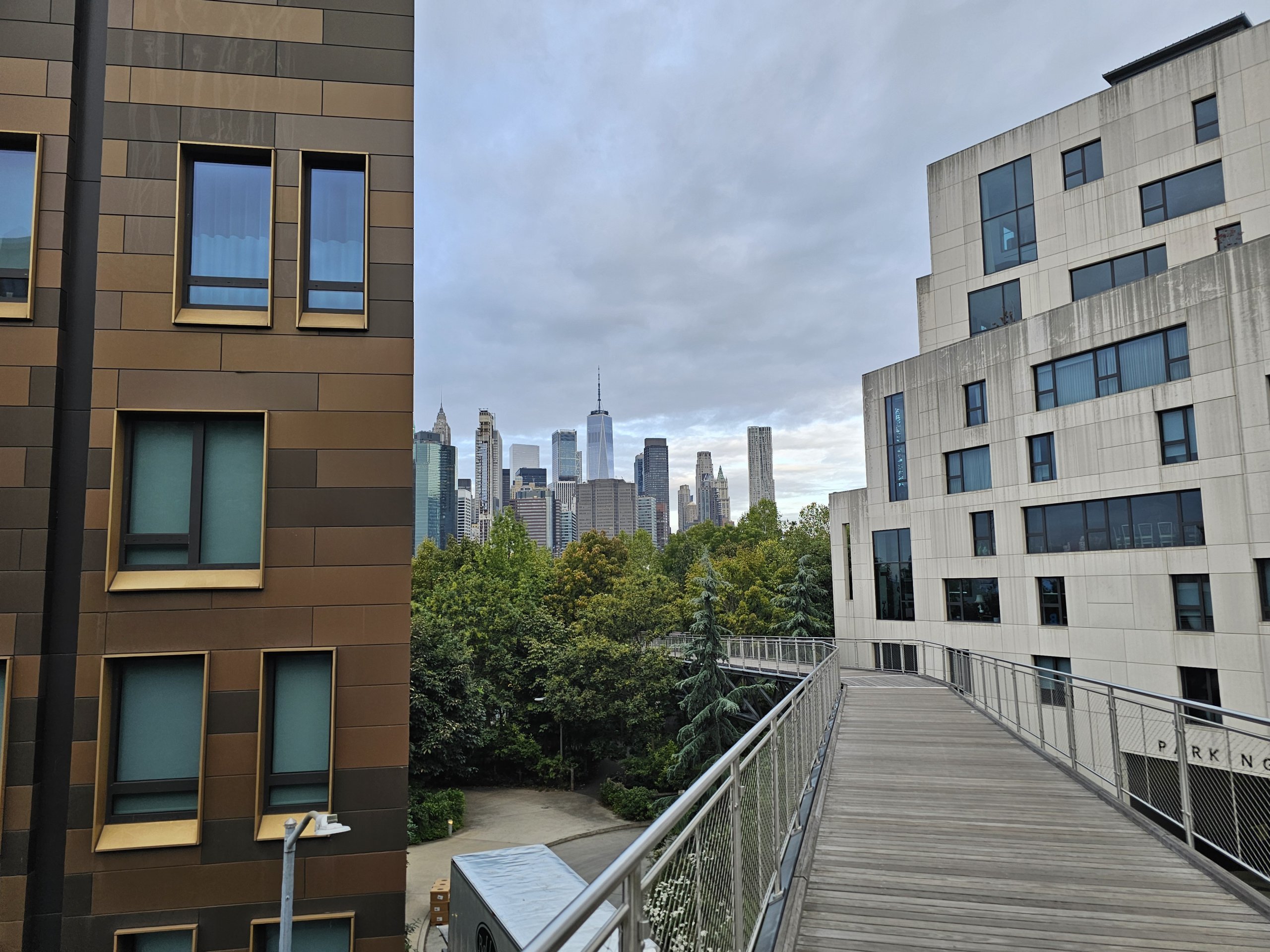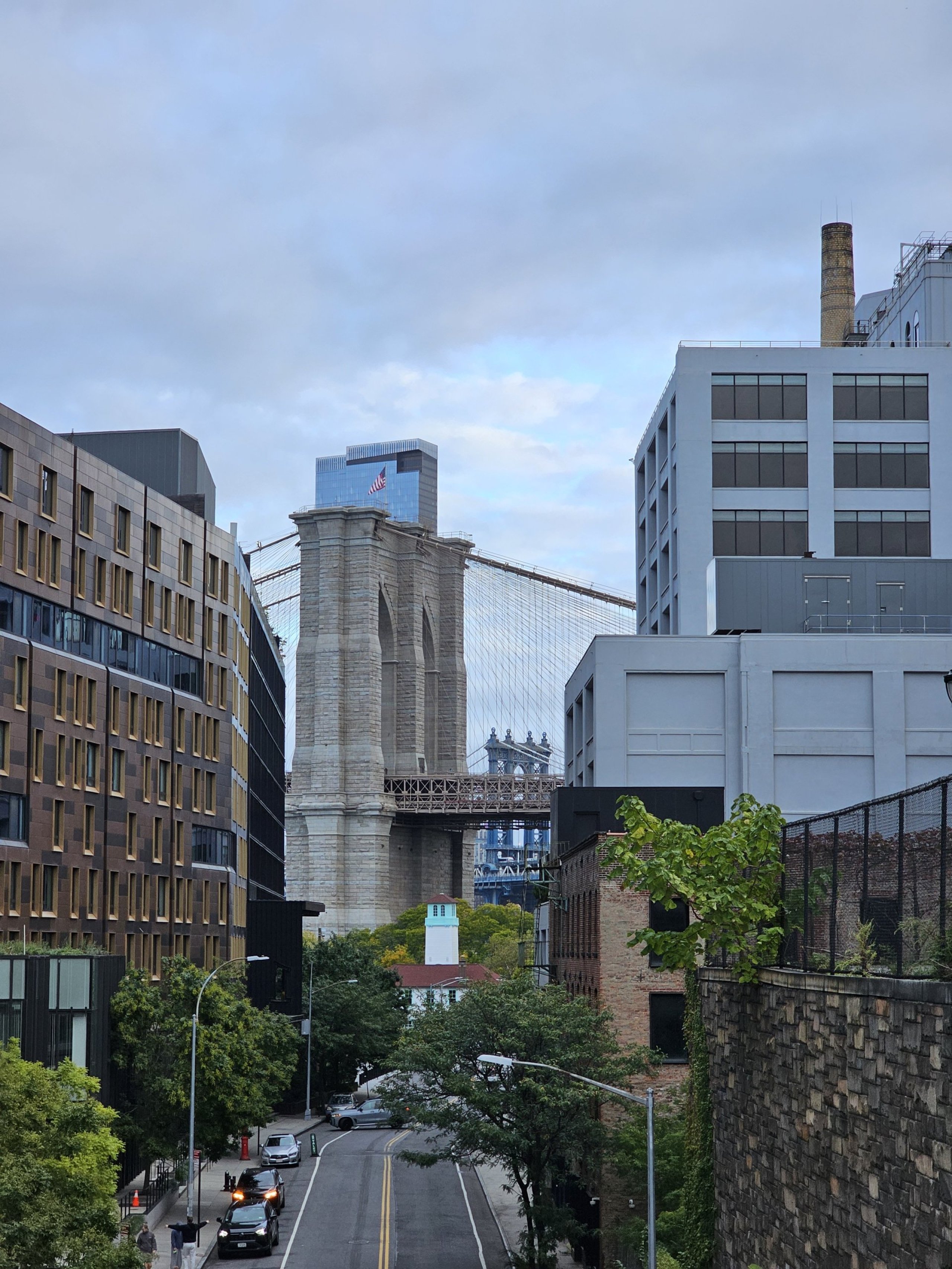 Интересна гледка не само към далечен Манхатън, но и към един от пилоните на Бруклинския мост, може да се види от късия пешеходен мост в парка Скуиб, който е в непосредствена близост до парка Бруклински мост.
