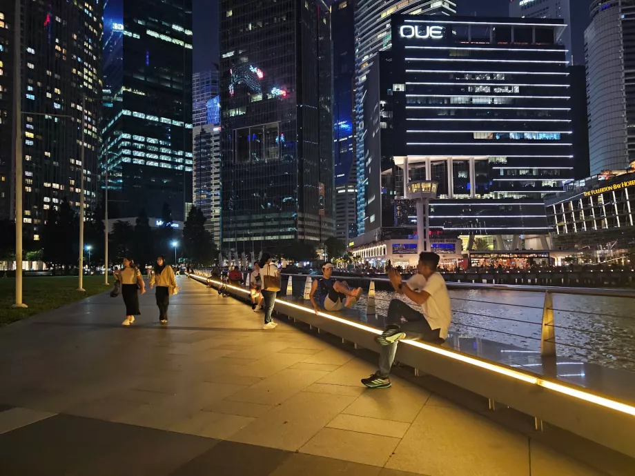 Красотата му се разкрива най-вече в нощното осветление на небостъргачите, хотел Marina Bay Sands, който разполага със световноизвестен плувен басейн на покрива си, виенско колело и статуи на лъвове по протежение на залива.