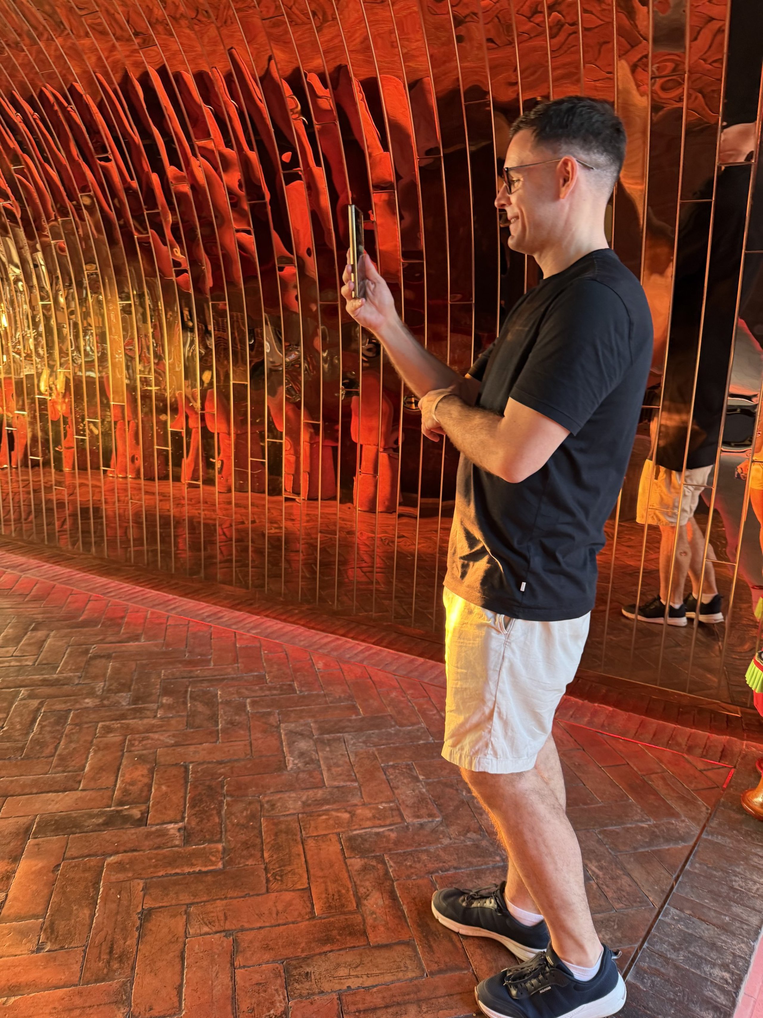 Огледална обсерватория на две нива с 360° гледка, в която хората и градът на заден план са красиво отразени.
