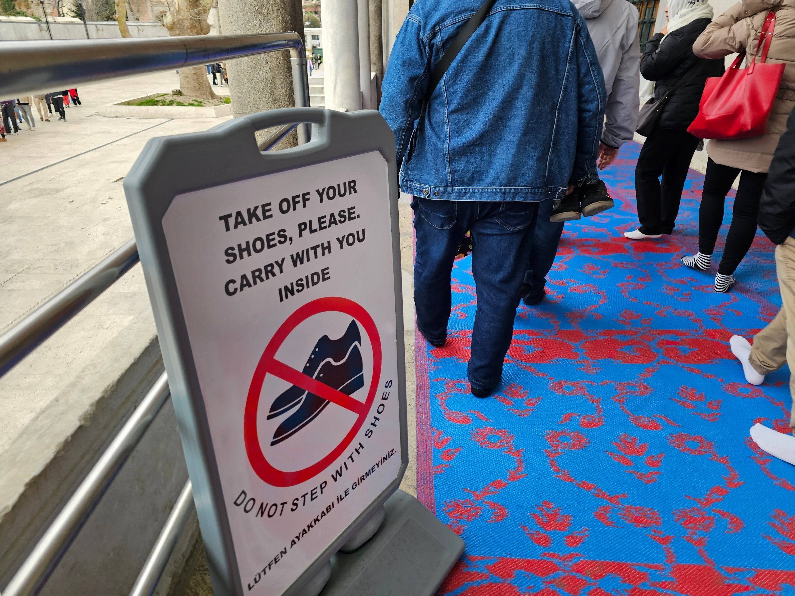 - преди да влезете, събувате обувките си и ги носите в ръка през цялото време (изходът е от другата страна, отколкото входът)