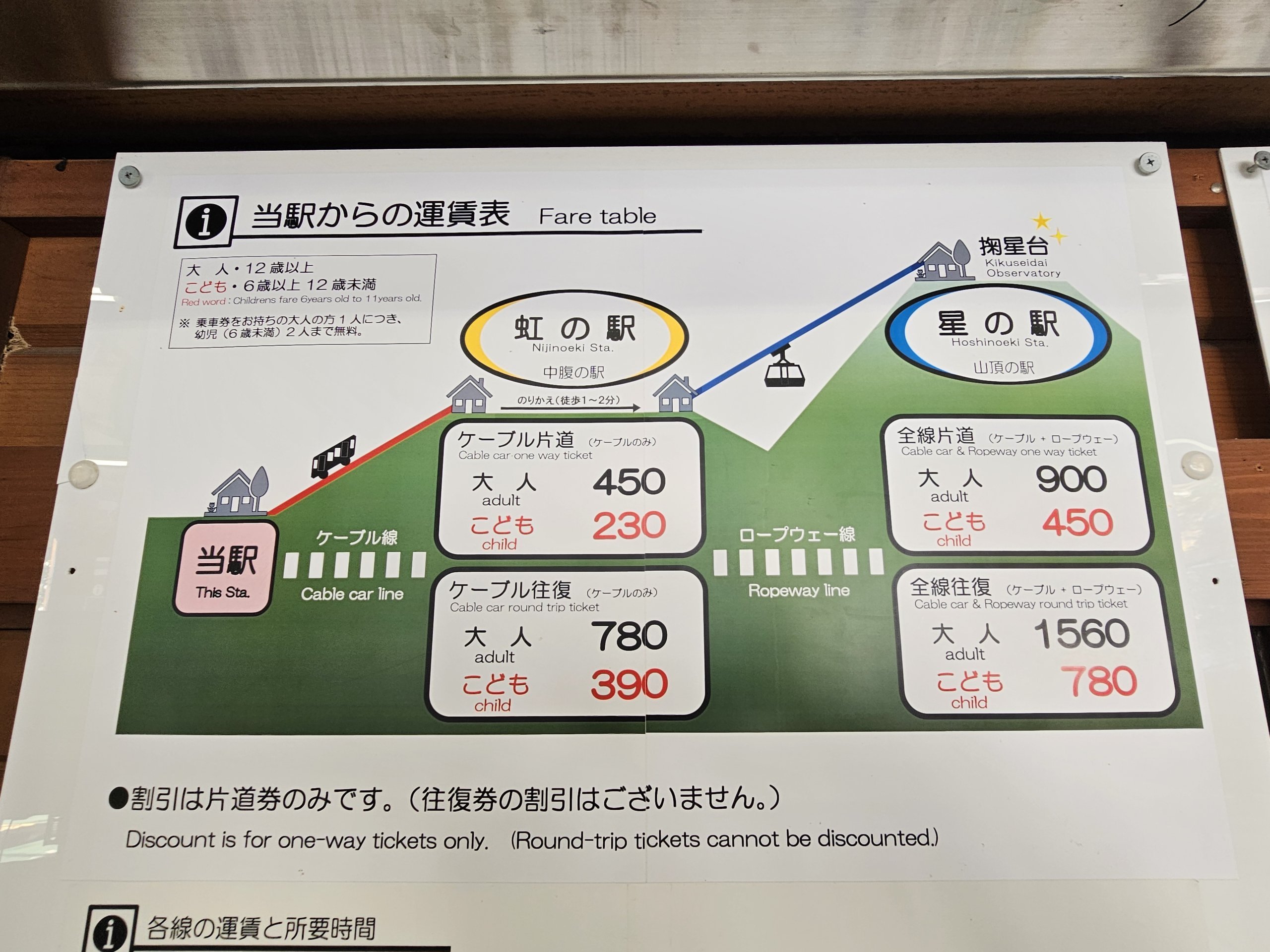 - 780 jpy - двупосочно пътуване само до средата на хълма (фуникуляр)