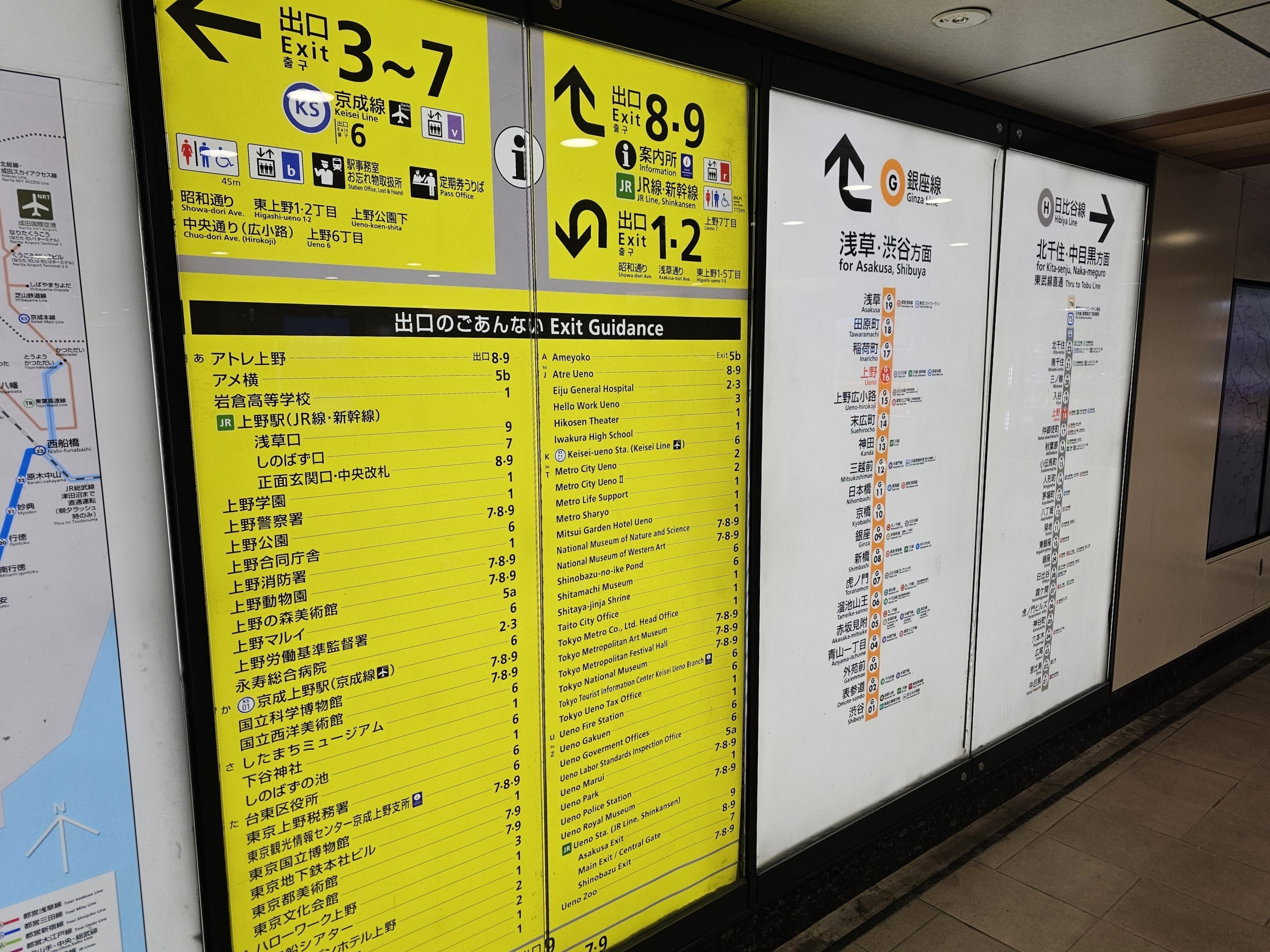 На картата винаги са отбелязани с букви различните изходи от станцията. След това тези букви са ясно обозначени в жълто в целия район на станцията.