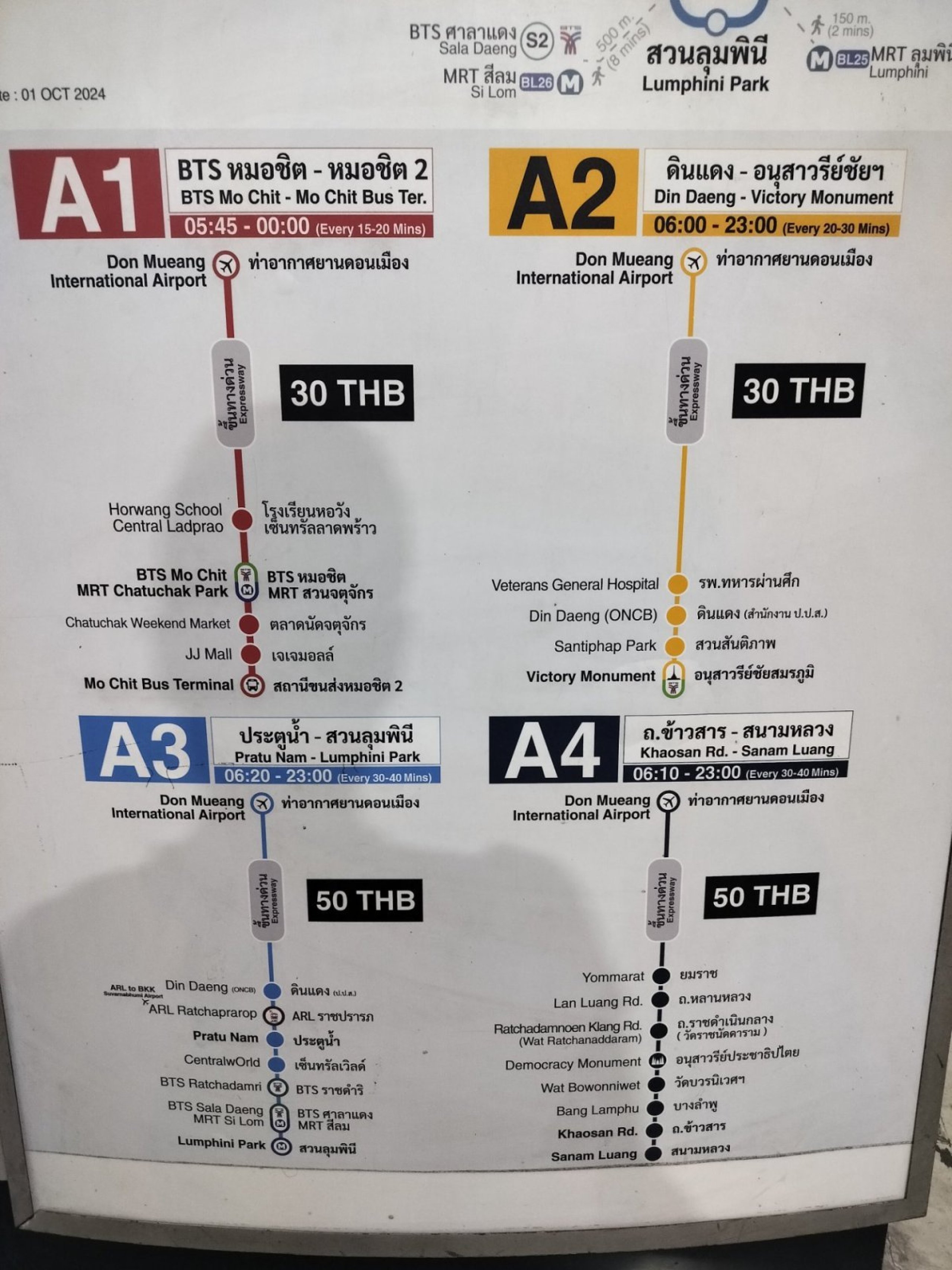 Автобусите спират пред международния терминал на изход 6. От националния терминал ясни указателни табели ще ви отведат до автобусната спирка за около 5 минути пеша. На летище Суварнабхуми автобусите спират на изход 3 на ниво пристигащи.