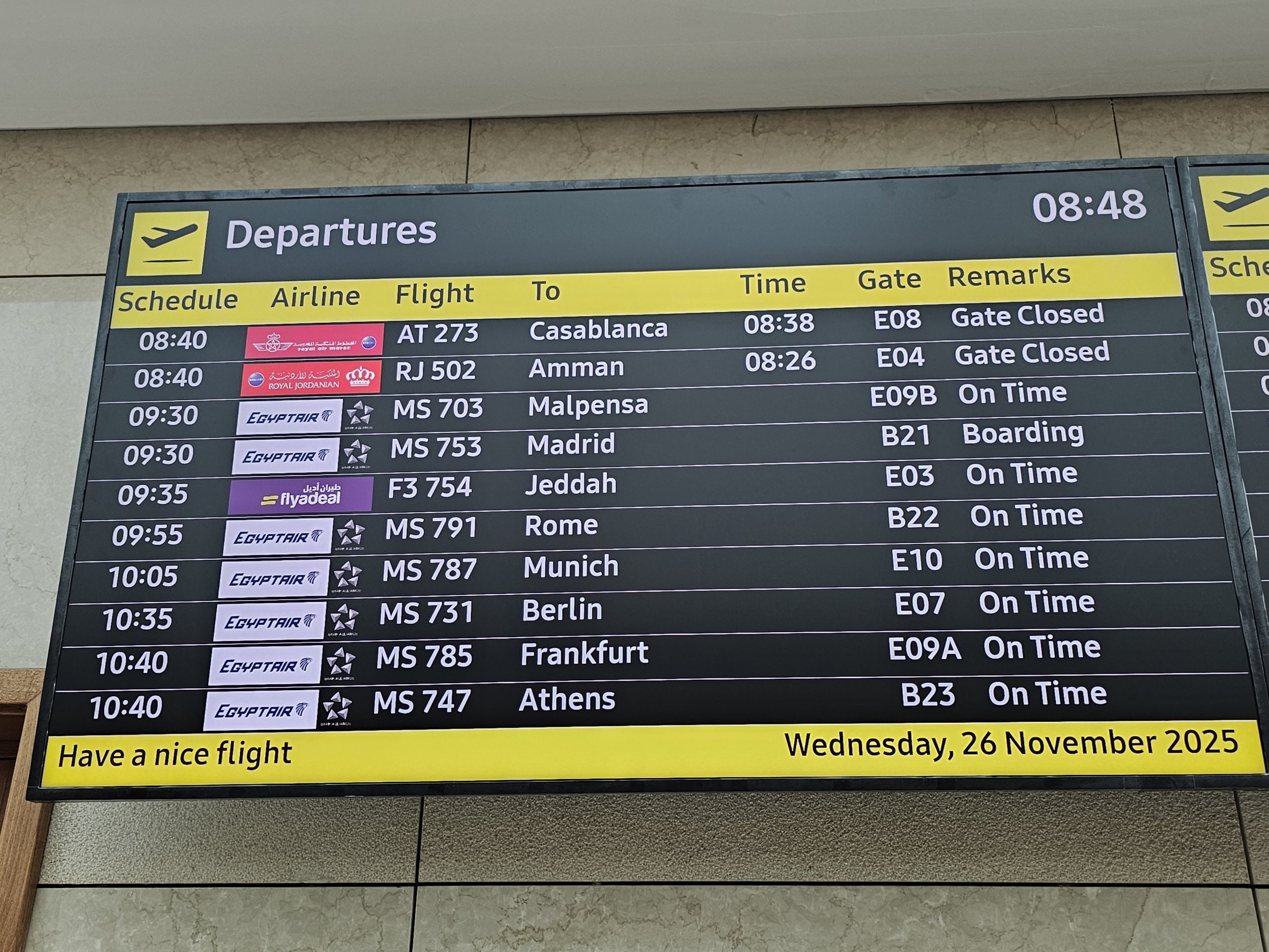 Търсите пристигащи или заминаващи самолети от/за летище Cairo Airport онлайн в реално време, за да проверите закъсненията или времето за качване на борда? Официалният уебсайт на летището винаги предлага най-точната информация: