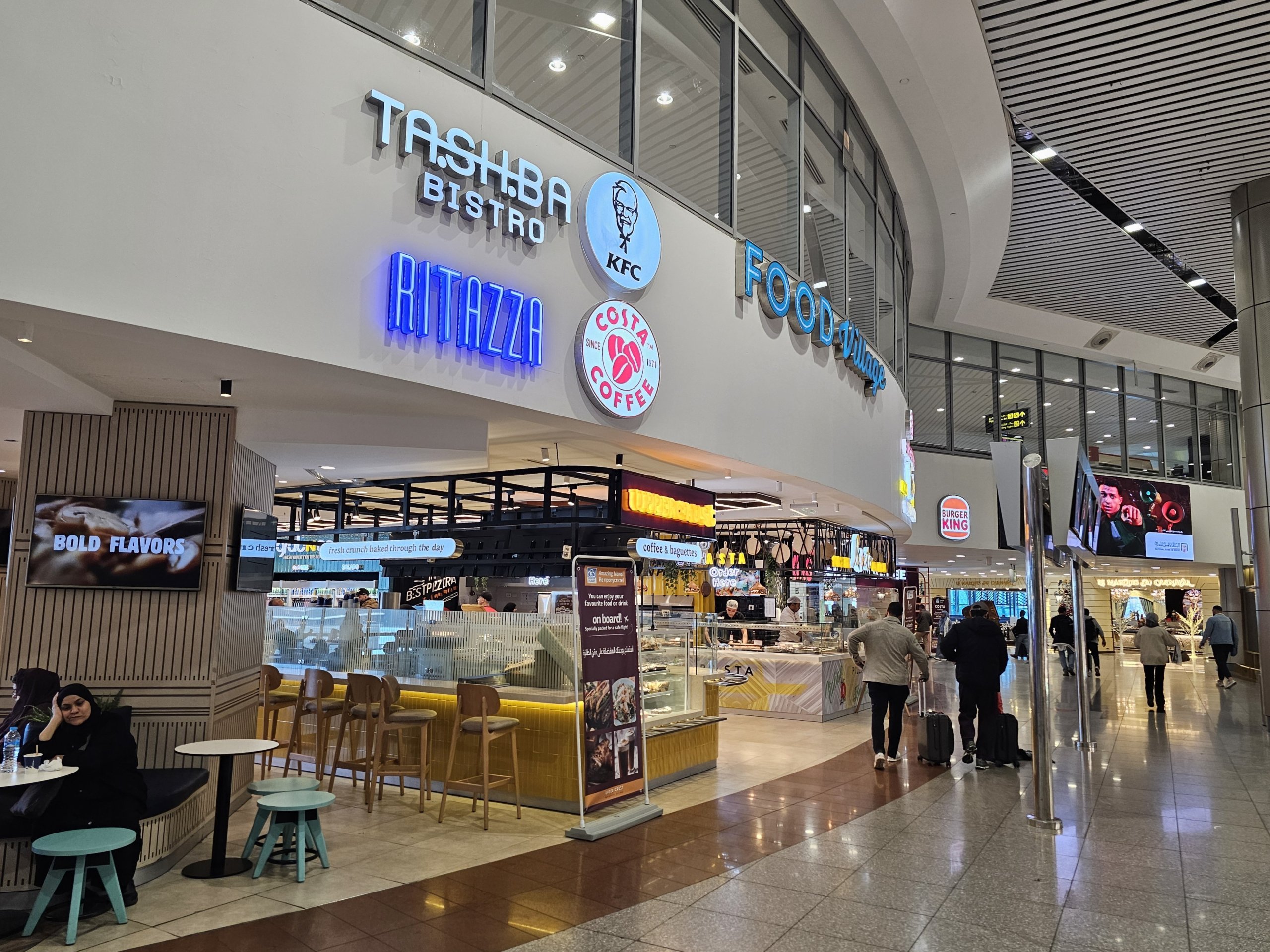 Повечето ресторанти се намират след зоната за сигурност и обикновено са отворени 24 часа в денонощието, 7 дни в седмицата.