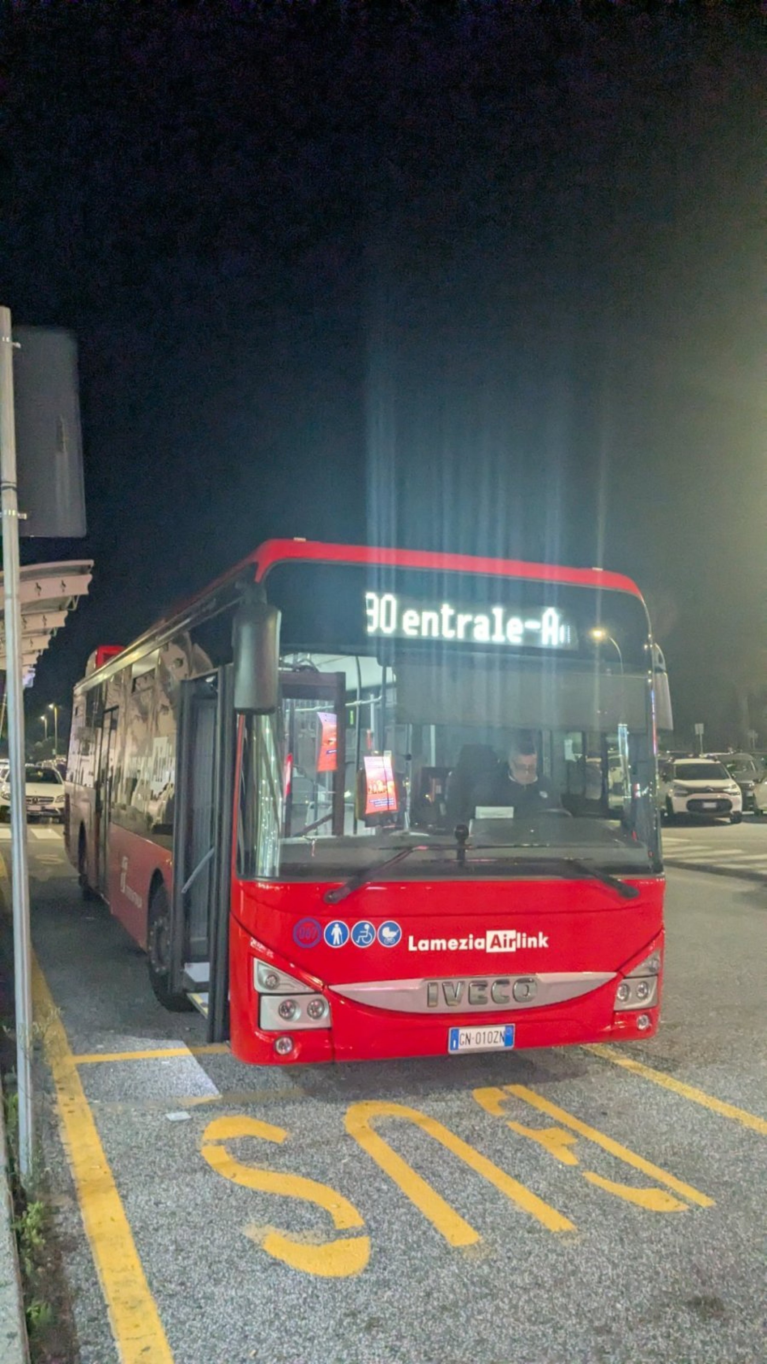 Въпреки че последната връзка по линия 90 от летището до жп гарата тръгва едва в 23:15 ч., последният автобус от гарата до центъра на Ламеция Терме тръгва около 22:20 ч. След този час можете да вземете само такси до центъра.