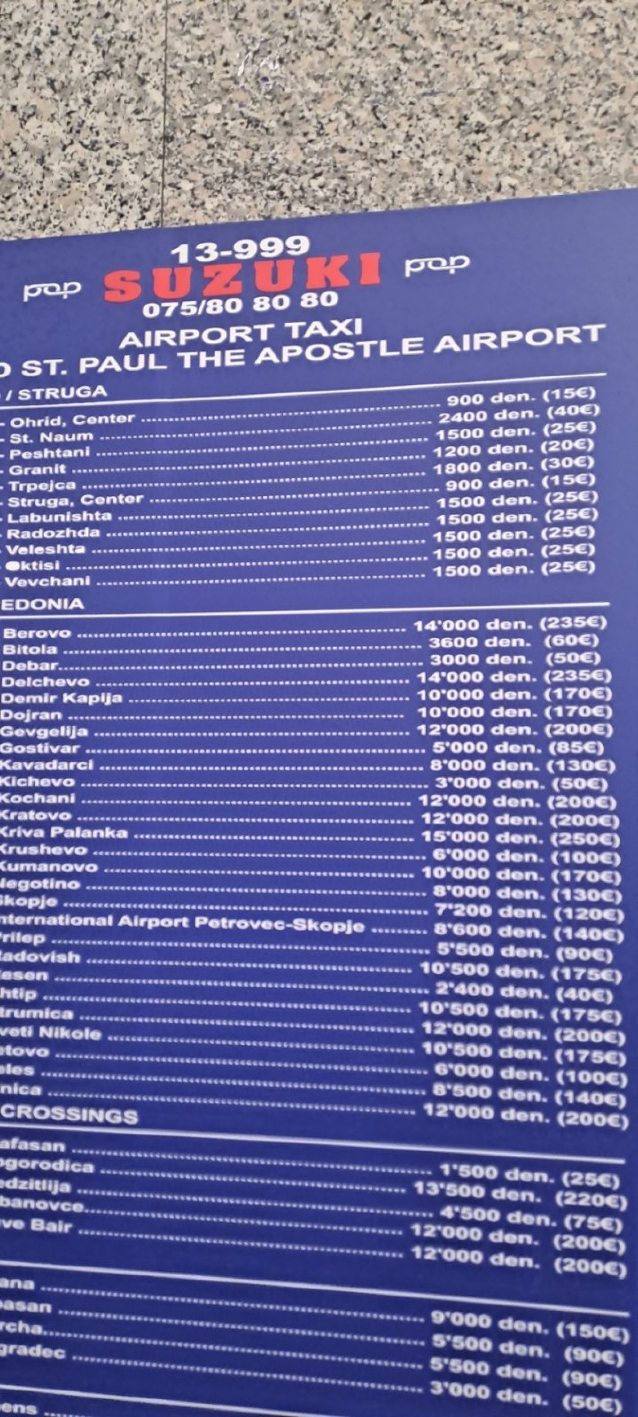 Тук не се използват таксиметрови апарати, а пътуванията се основават на официалните цени, достъпни например на уебсайта на летището: ohd.airports.com.mk/taxi.