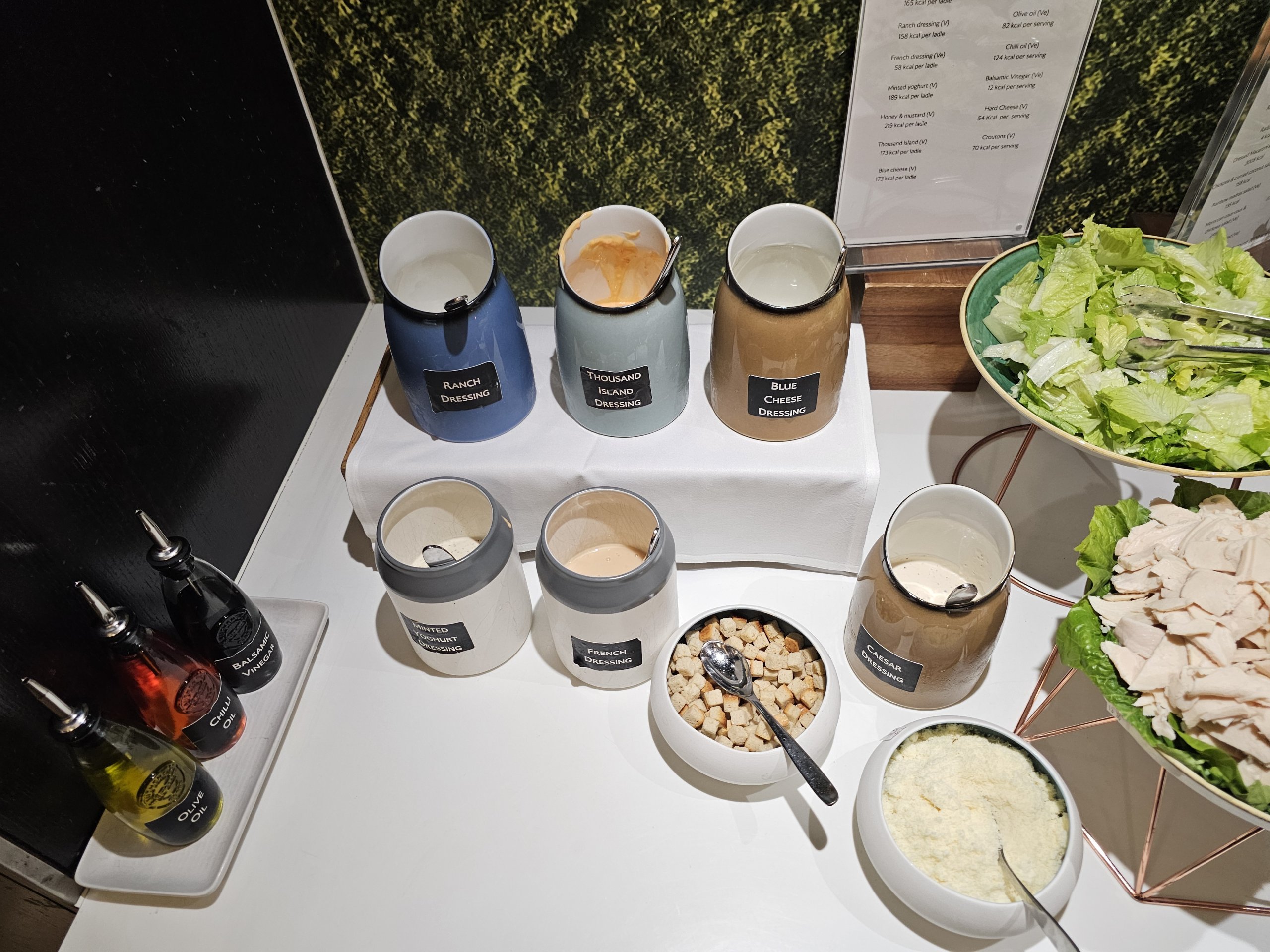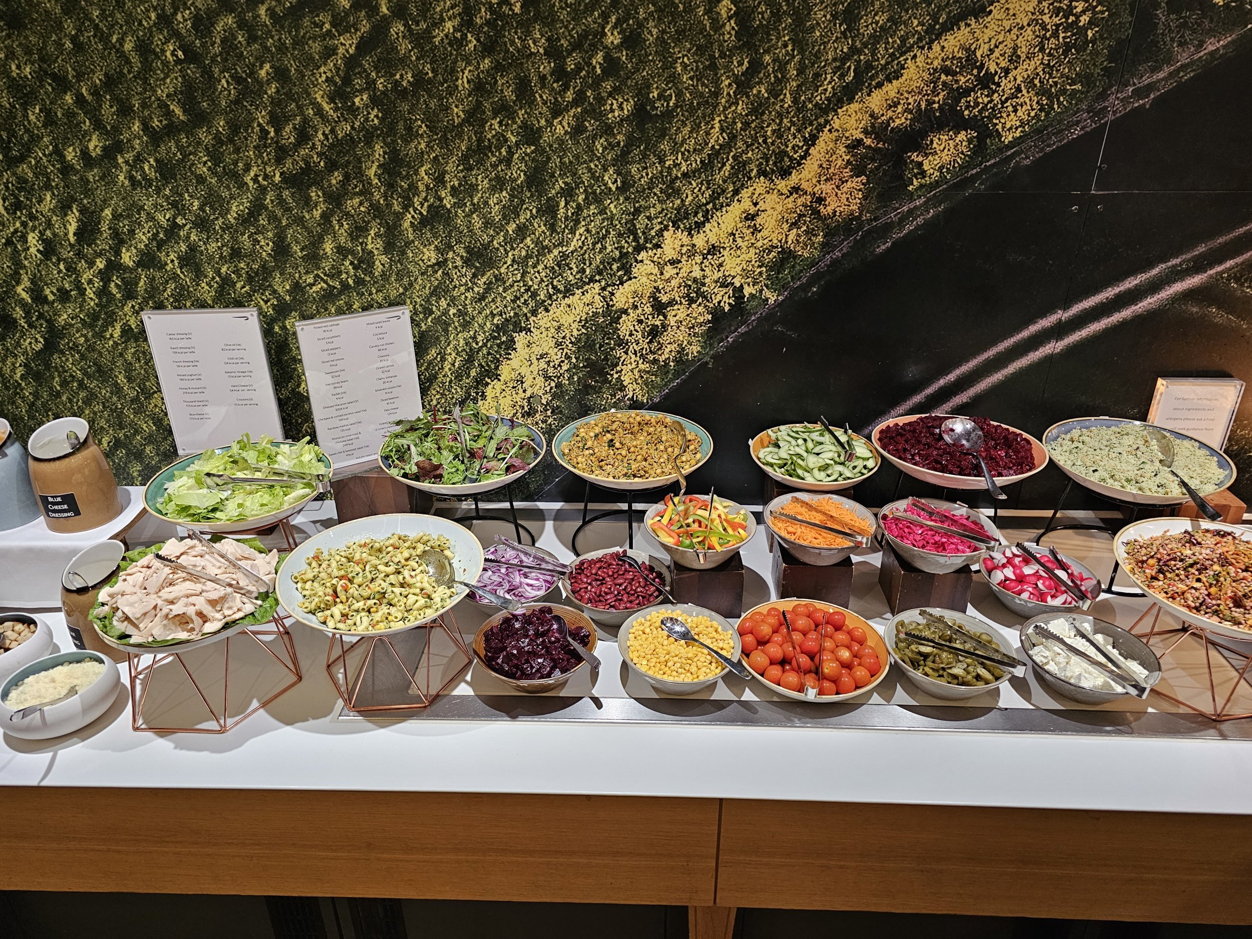 Менюто със студена храна включва няколко зеленчука, салата с избор от различни дресинги и много ограничен и слаб избор от сладкиши (на практика само сладки).