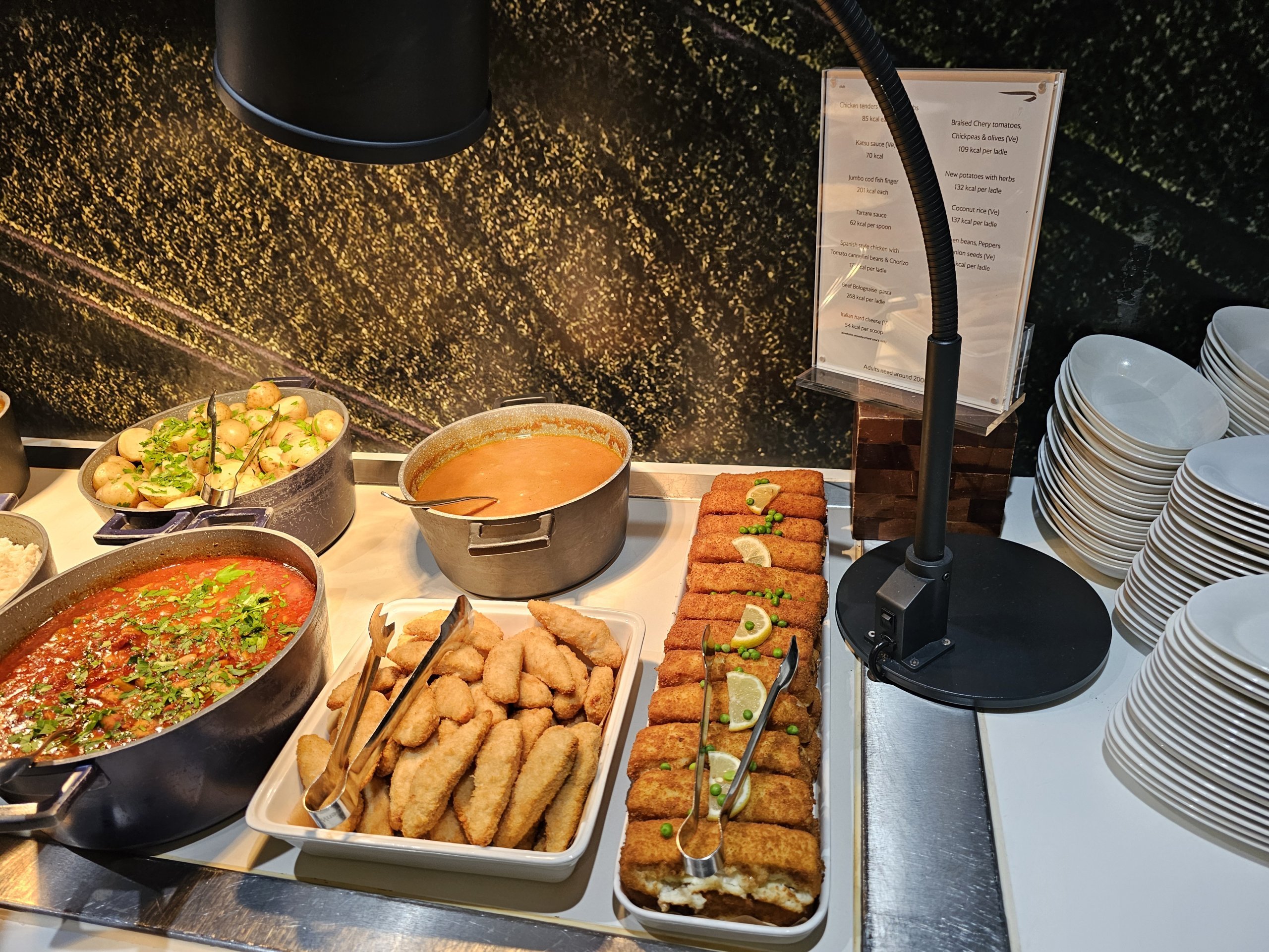 Топлата храна разполага с меню за закуска (до около 11:30 ч.) и меню за обяд (до затварянето на салона). Супа се предлага през целия ден.