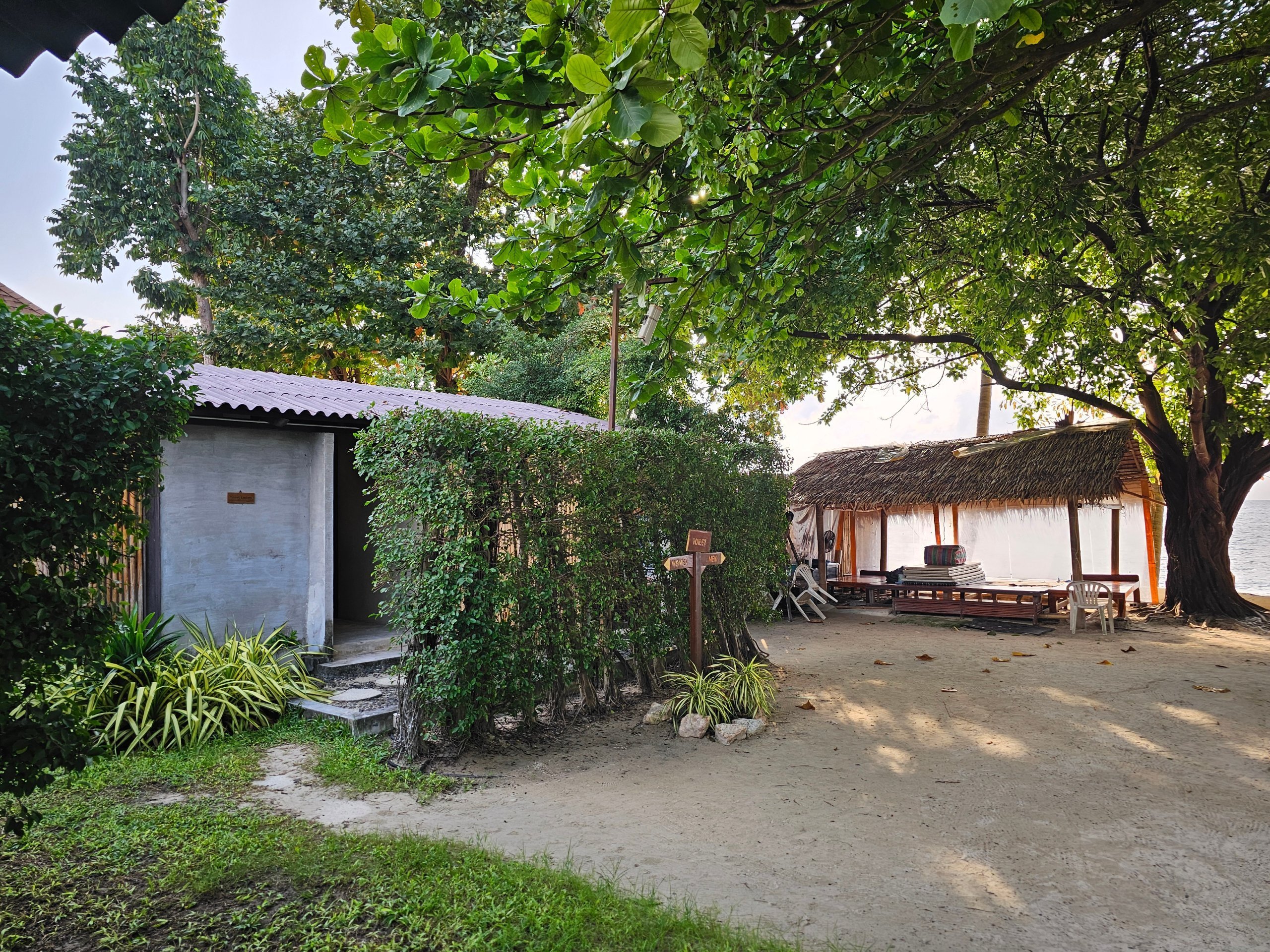 И въпреки че входът към курорта е директно от главния път, отделните стаи и бунгала са отделени от града с малък скален масив, така че шумът от коли и мотори изобщо не достига до тук.
