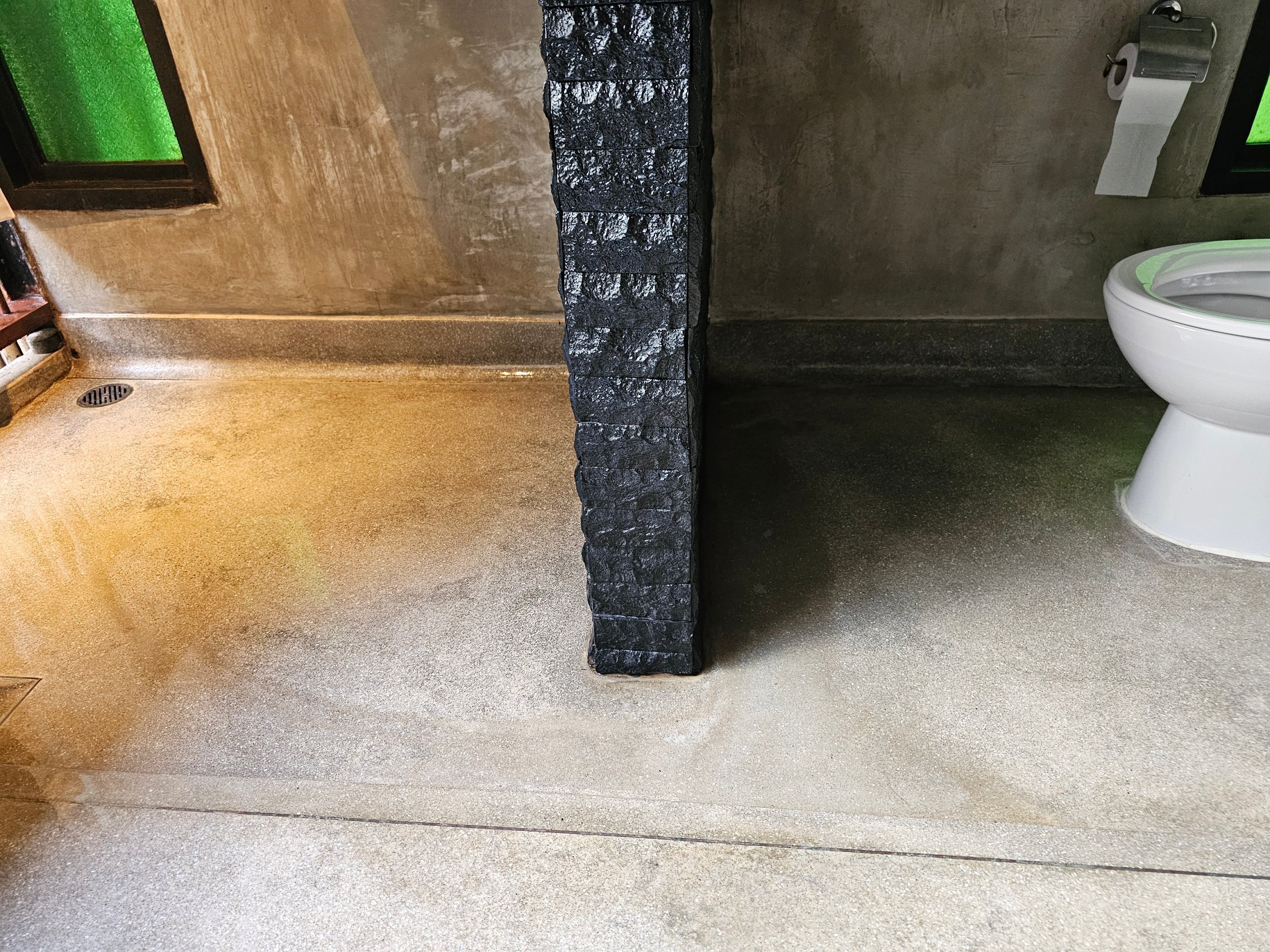 Банята е затворена от четирите страни, но няма таван, което е умишлена конструктивна особеност.