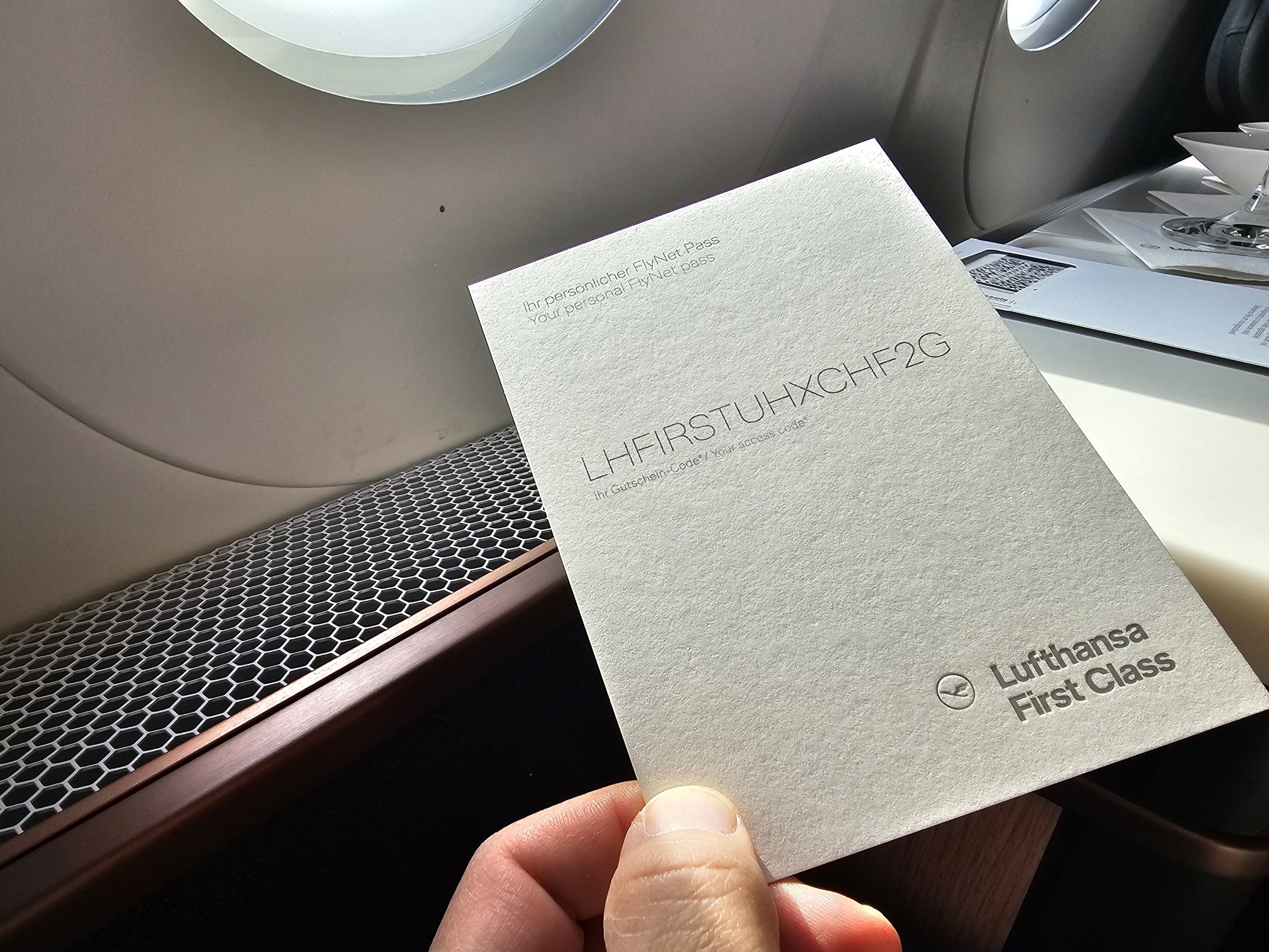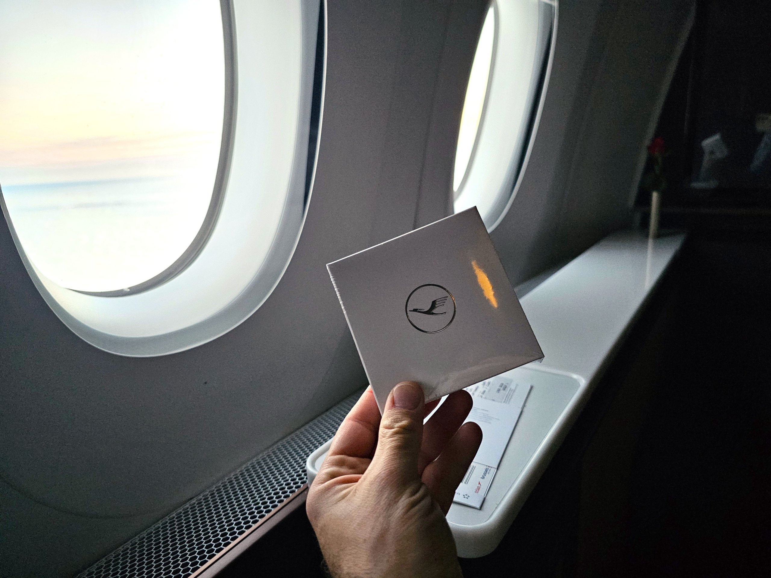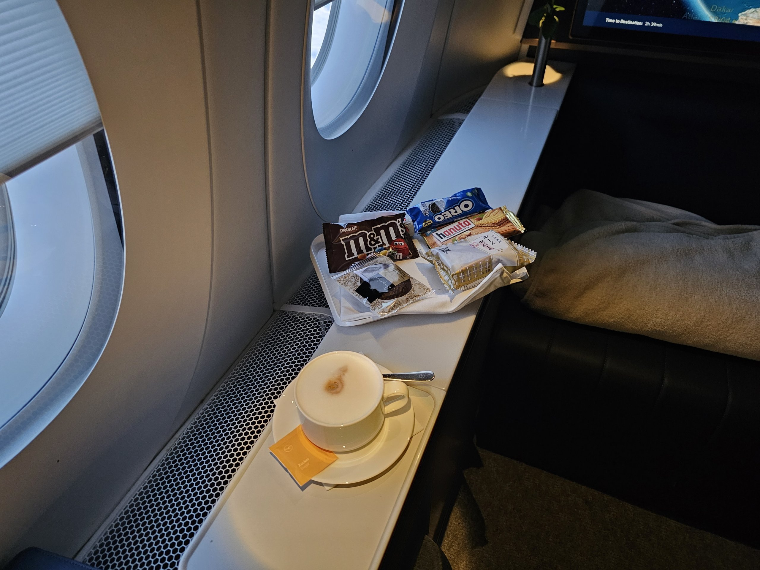 Предложенията за храна за закуска са малко слаби, но това ме устройва, защото вече знам от полетите от Франкфурт до Япония, че обслужването в първа класа на Lufthansa е повече от адекватно.