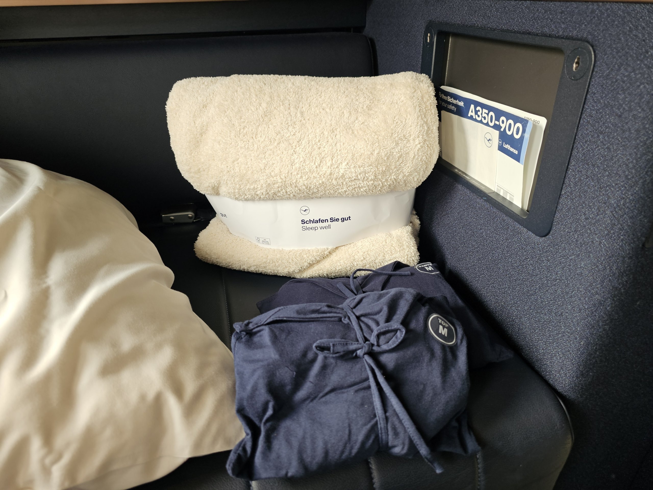 Седалката е оборудвана с изключително удобна възглавница и одеяло, които могат да се използват по всяко време на полета. За спане след това ще получите от екипажа още едно одеяло и спално бельо.
