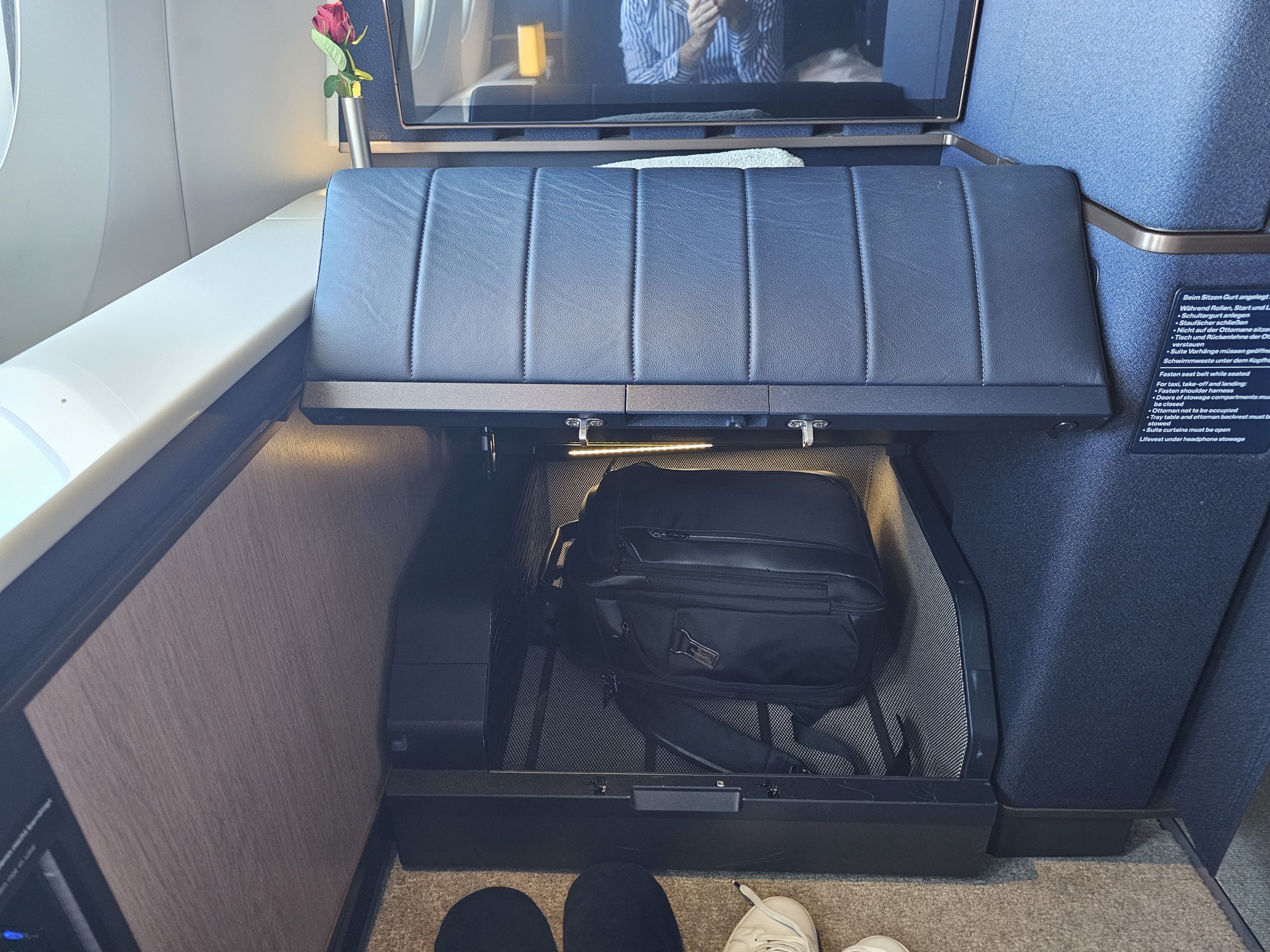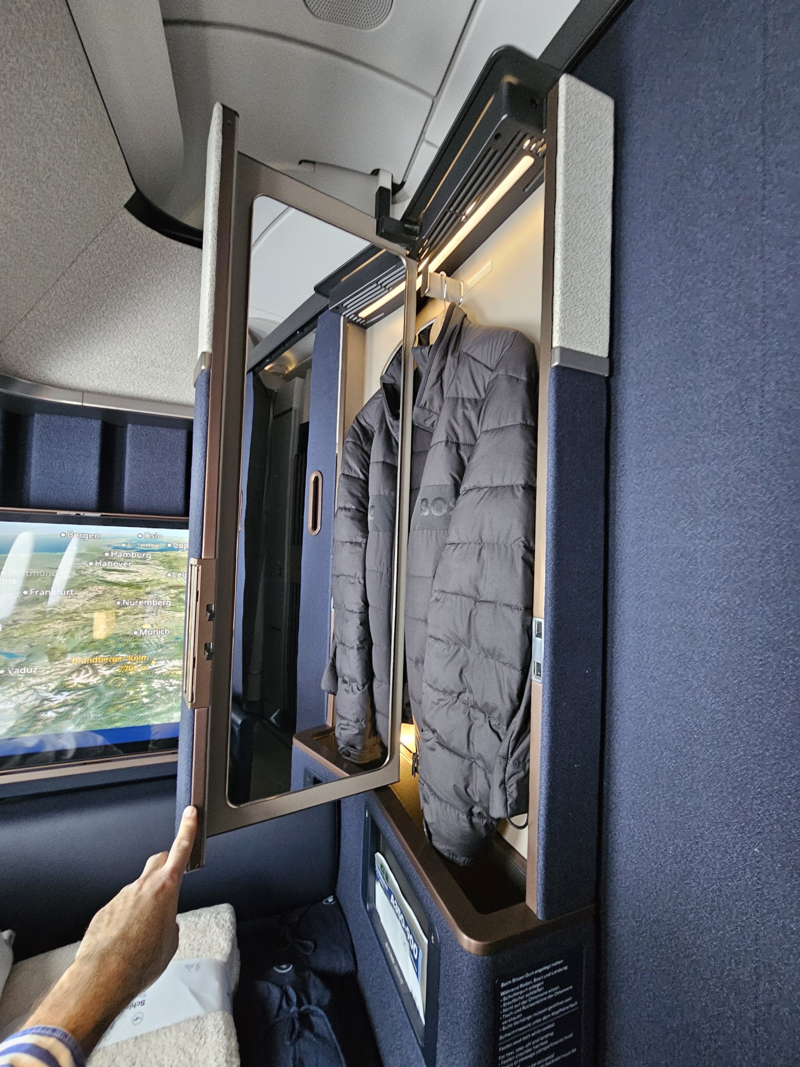 Дизайнът е доста строг на немски език, но за мен е много елегантен! Разбира се, новият La Premiere на Air France може да е с по-уморителен дизайн, но отново няма врата от пода до тавана или параван, което за мен е абсолютно необходимо в първа класа.