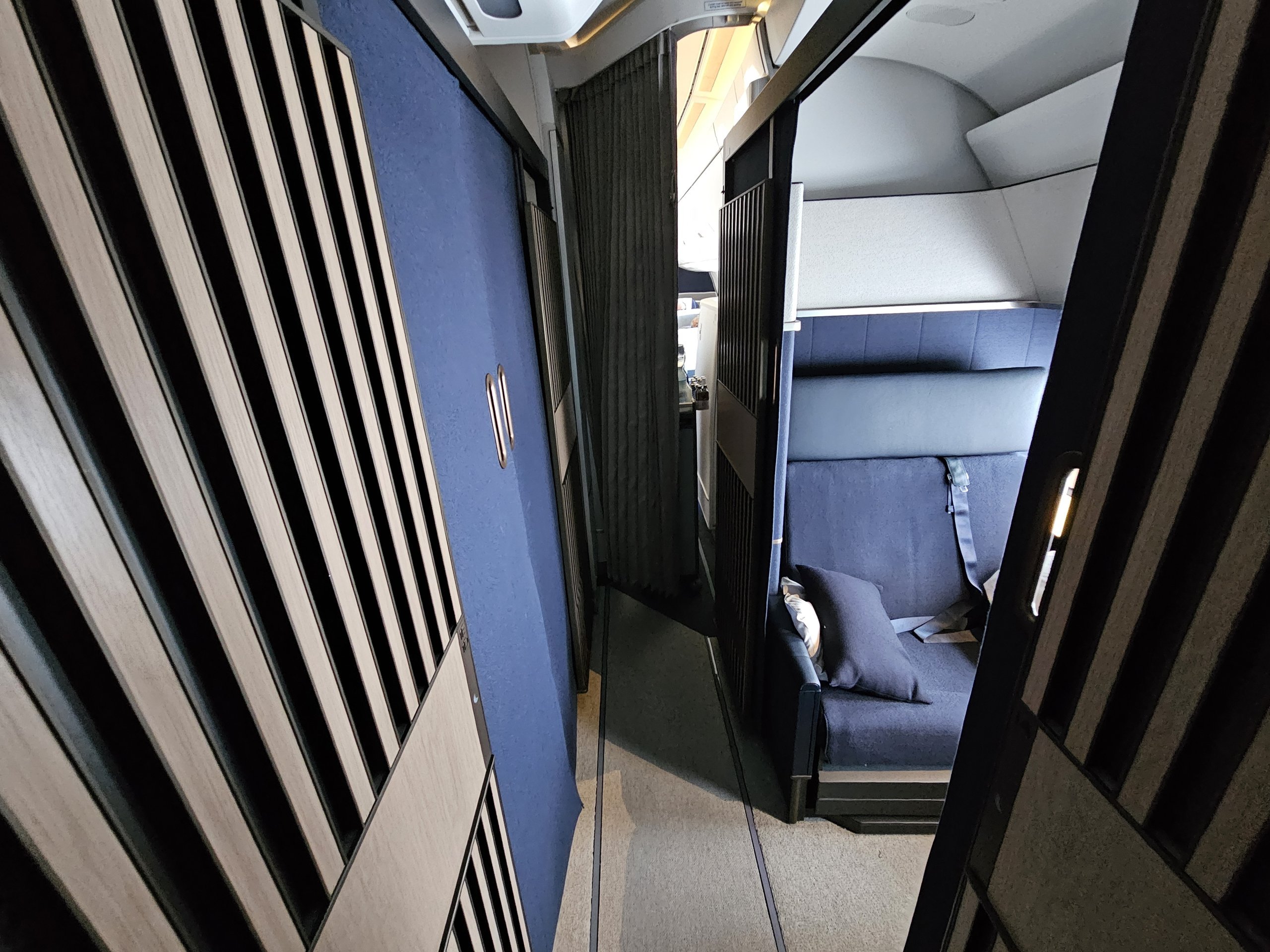 Затова малко след обяд отивам до тоалетната, за да се преоблека в пижама. Междувременно услужлив стюард подготвя леглото ми (можете сами да разгънете седалката с натискането на един бутон, но чаршафите и одеялото са поставени в отделения, до които има достъп само екипажът).