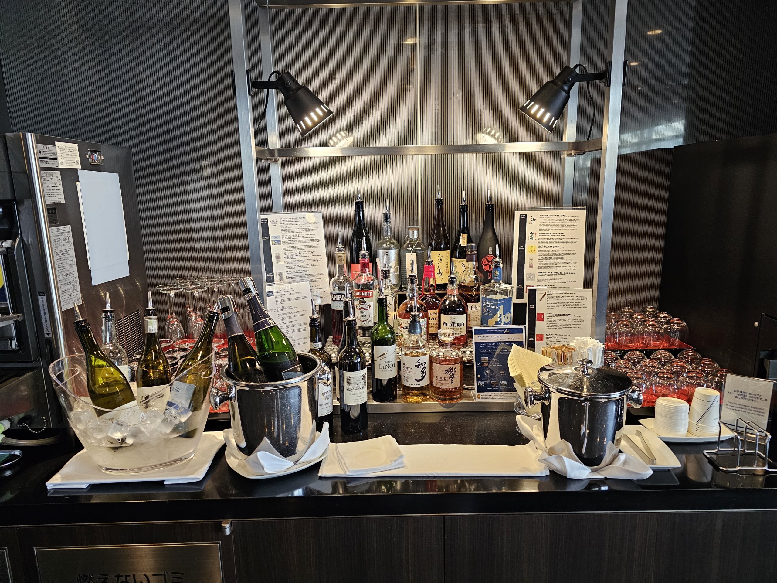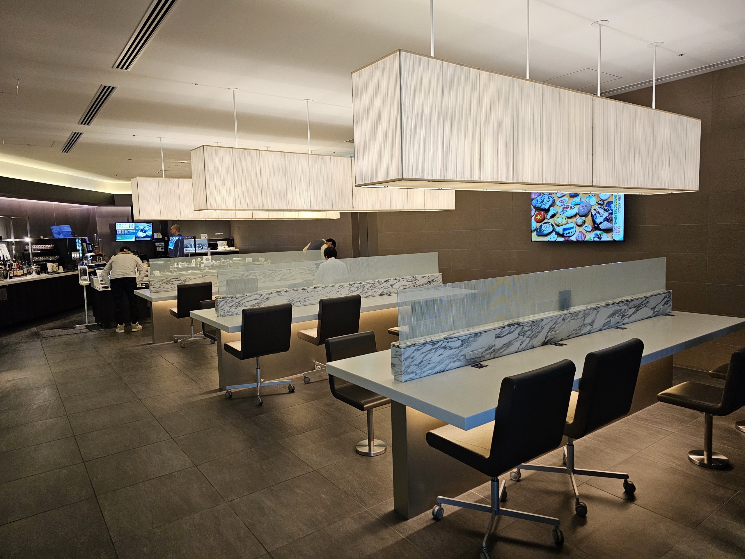 Салонът е много просторен, с чудесен изглед към асфалта и множество кабинки, които имитират местата за първа класа на ANA Japan Airlines.