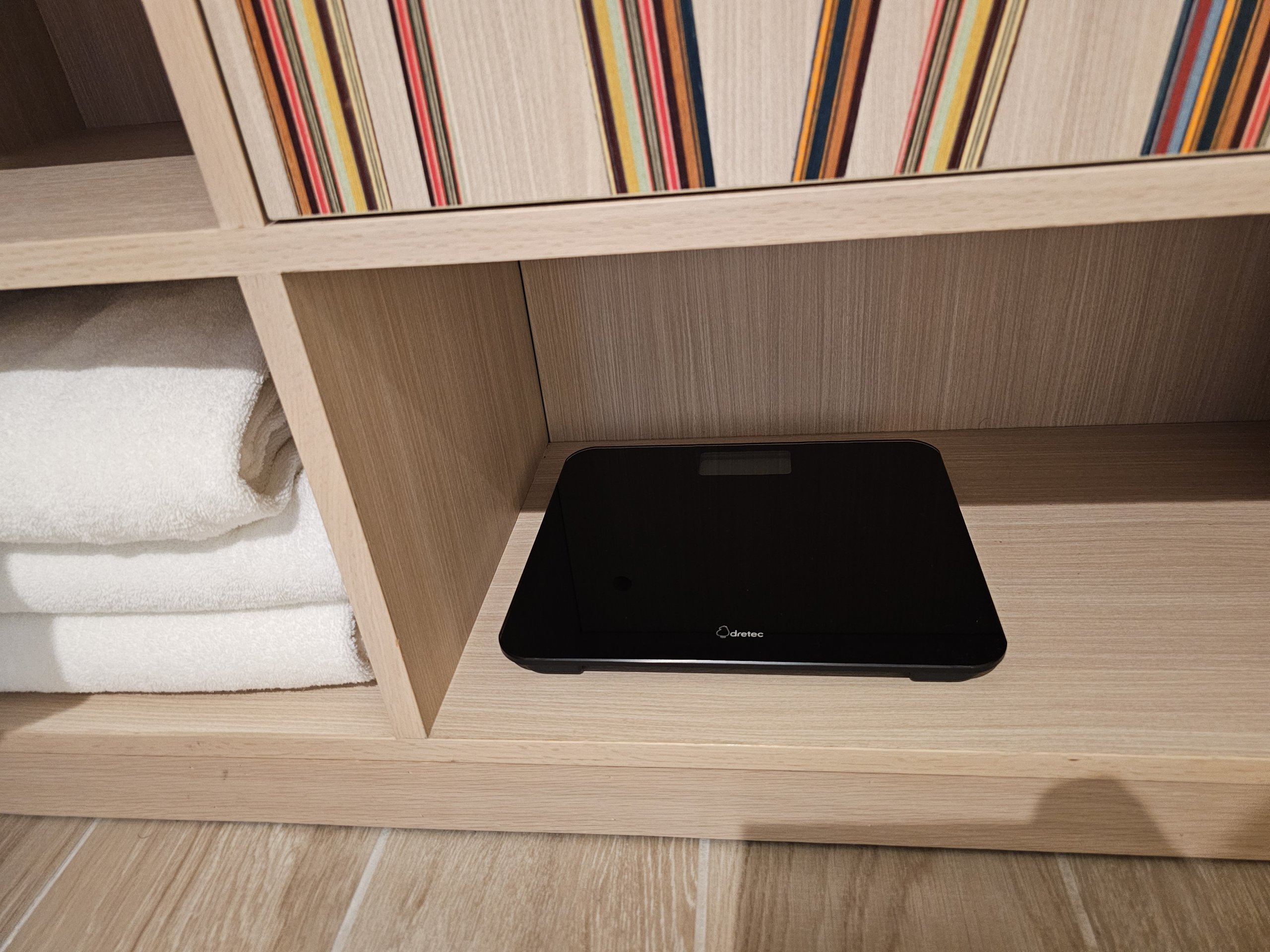 Разклонители, включващи USB-A и USB-C конектори, са разположени както до леглото, така и на плота с кафемашината. Единственото нещо, което малко ме притеснява, е климатикът, който се намира само във входното антре, а не точно до леглото.