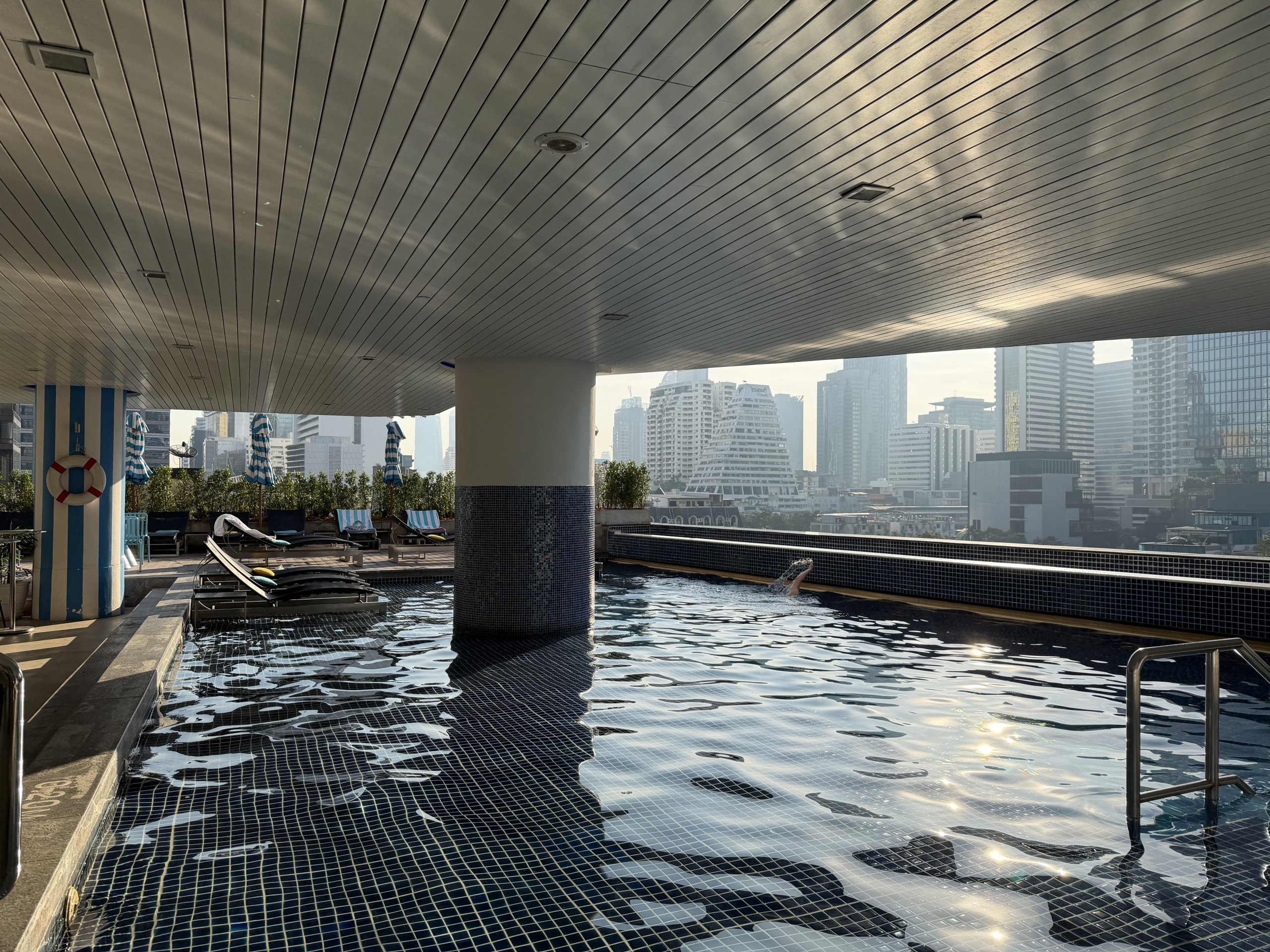 Басейнът не е изключително голям, но има едно голямо предимство - гледка към хоризонта на Банкок, включително към втория по височина небостъргач , King Power Mahanknhon.