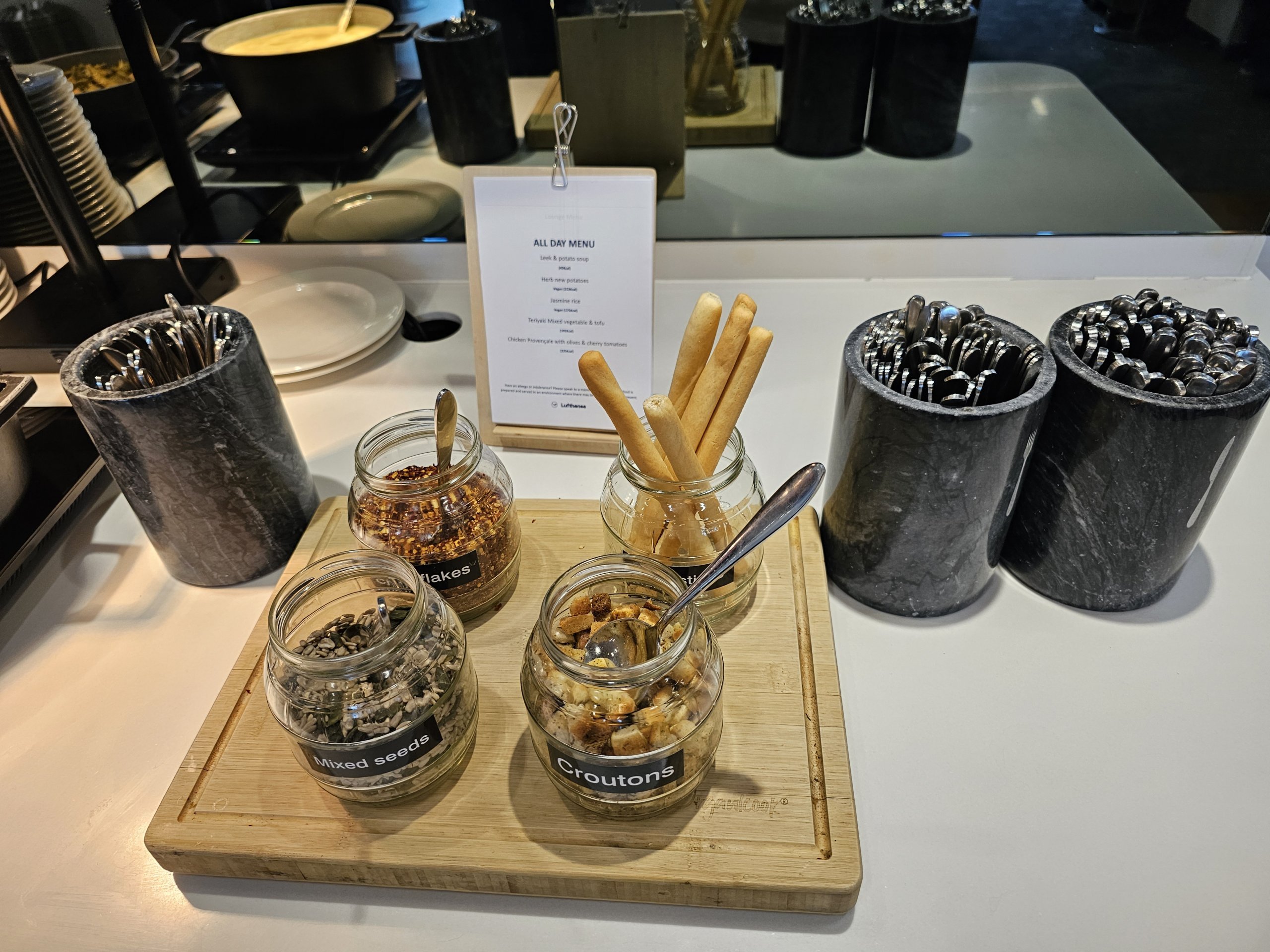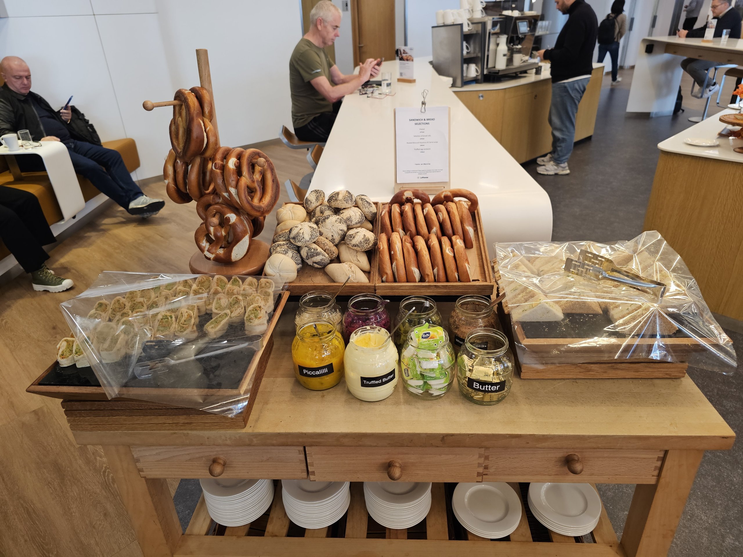 Салонът на Lufthansa на летище Хийтроу е доста приятно място за бърза закуска преди полет, както и за бърза работа на многобройните маси, подходящи за лаптопи.
