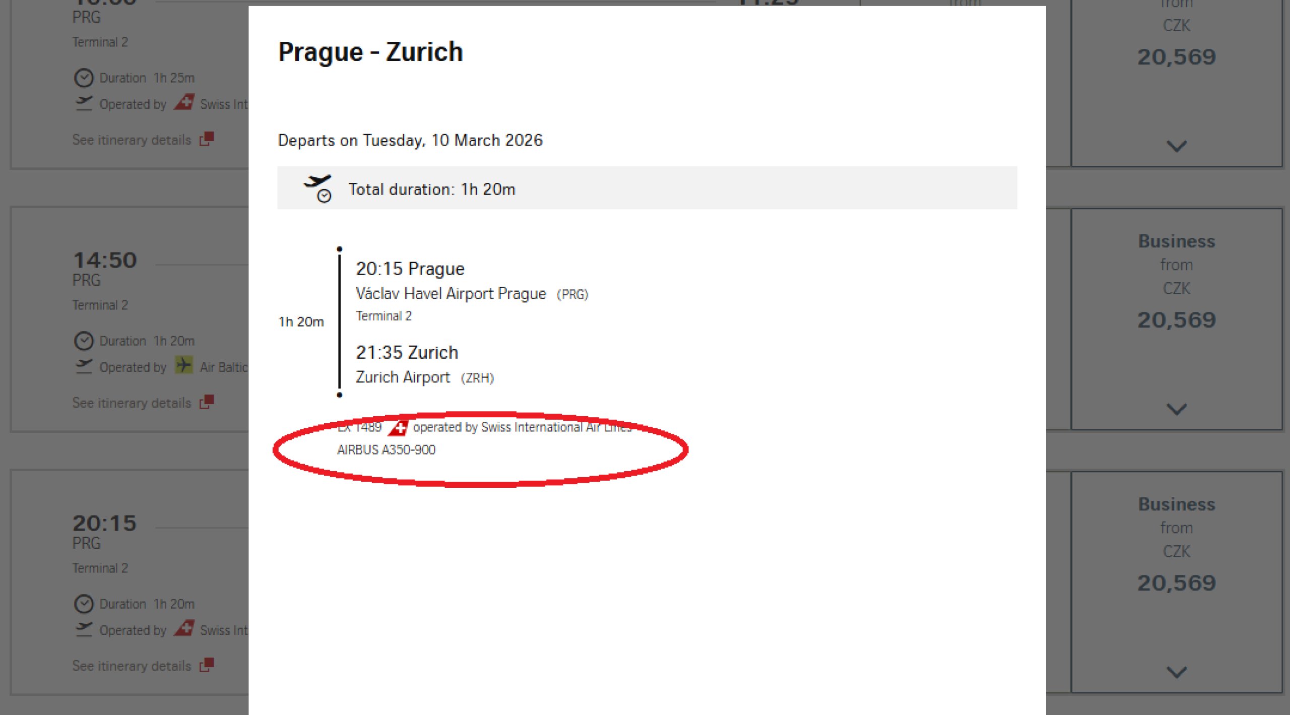 Широкофюзелажният самолет по почасов маршрут между Прага и Цюрих е рядкост. А ако летите с A350, искате да изберете място, което няма да срещнете при редовните европейски полети.